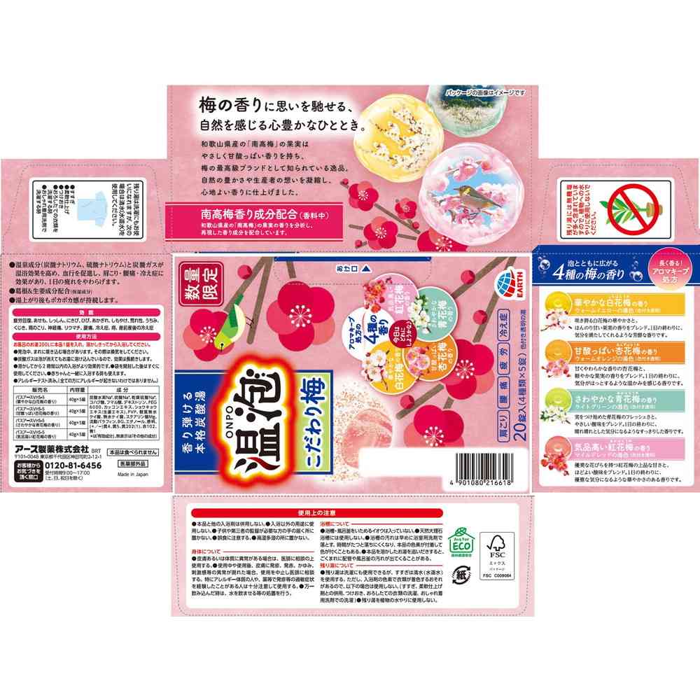 ●香り弾ける本格炭酸湯 【泡とともに広がる4種の梅の香り】長く香る!アロマキープ処方 【効能】疲労回復、あせも、しっしん、にきび、ひび、あかぎれ、しもやけ、荒れ性、うちみ、くじき、肩のこり、神経痛、リウマチ、腰痛、冷え症、痔、産前産後の冷え症