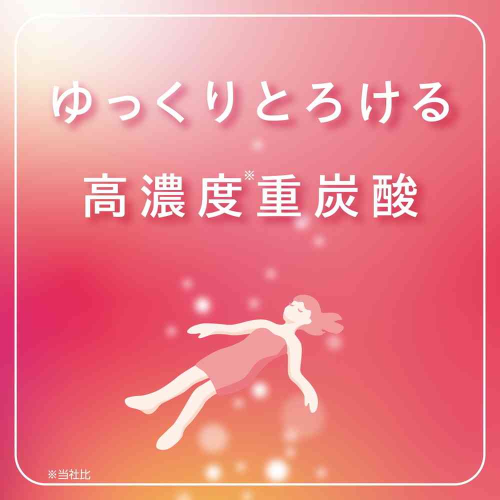※本品は食べられません。 ●配合成分により、浴槽や洗い場では滑りやすくなるので、十分に注意する。 ●本品と他の入浴剤は併用しない。 ●入浴以外の用途には使わない。 ●一部の溶け残りが生じる場合があるが、湯をかき混ぜるときれいに溶ける。 ●子供や第三者の監督が必要な方の手の届く所に置かない。 ●高温多湿の所に置かない。 ●お風呂のお湯200Lに本品1錠(100g)を入れ、溶かしきってから入浴してください。 ●発泡中、まれに咳き込む場合があります。その際は換気をしてください。 ●重炭酸は泡が消えてもお湯に溶け込んでいるので、効果は長続きします。 ●溶かしてから2時間以内の入浴がより効果的です。 ●袋を開封した後はすぐに使用してください。 ●赤ちゃんと一緒に入浴する時も使えます。 ●パッチテスト済み。(全ての方に刺激が起きないわけではありません。) 【身体について】 ●皮膚あるいは体質に異常がある場合は、医師に相談の上使用する。 ●使用中や使用後、皮膚に発疹、発赤、かゆみ、刺激感等の異常が現れた場合、使用を中止し医師に相談する。 ●使用中にじんましん、息苦しさ等の異常が現れた場合には直ちに使用を中止し、医師に相談する。特にアレルギー体質の人や、薬等で発疹等の過敏症状を経験したことがある人は十分注意して使用する。 ●万一大量に飲み込んだ時は、水を飲ませる等の処置を行う。 【浴槽について】 ●浴槽・風呂釜をいためるイオウは入っていない。 ●天然大理石浴槽には使わない。 ●浴槽の汚れは早めに浴室用洗剤で落とす。時間がたつと落ちにくくなり、本品の色素が付着して色が付くこともある。 ●残り湯を長く浴槽に入れておくと底や浴槽のまわりが白くなることがあるが、すすぎ洗いをするときれいになる。 ●使用後は、風呂釜内部や循環口のフィルター等が白く汚れることがあるので、よく水洗いする。(風呂釜や配管の汚れににごり成分がつき、追いだき時に出ることがある。) ●全自動給湯器・24時間風呂の場合、機種によっては使用できない場合があるので、機種の説明書を確認の上、使用する。 【残り湯の利用について】 ●残り湯は洗濯にも使えるが、すすぎは清水(水道水)を使う。ただし、以下の場合は使わない。(柔軟仕上げ剤との併用、おろしたての衣類、つけおき、おしゃれ着用洗剤での洗濯) ●残り湯を植物の水やりに使用しない。