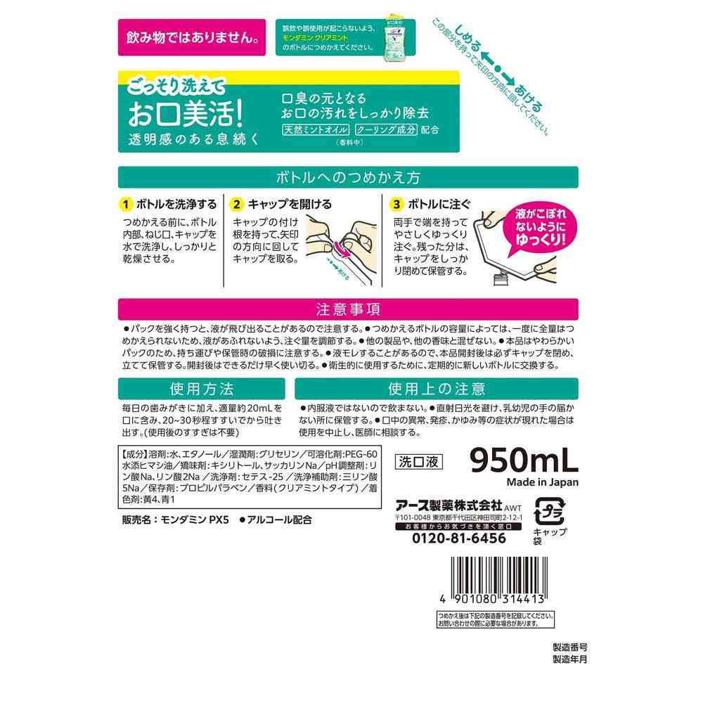 もんだみん、マウスウォッシュ、まうすうぉっしゅ、洗口液、口腔ケア、口臭ケア、オーラルケア、口臭予防、口臭対策、虫歯予防、虫歯対策、歯周病、歯肉炎、予防、対策、大容量、詰め替え用、詰め替え、つめかえ、詰替え、アルコールフリー、アース