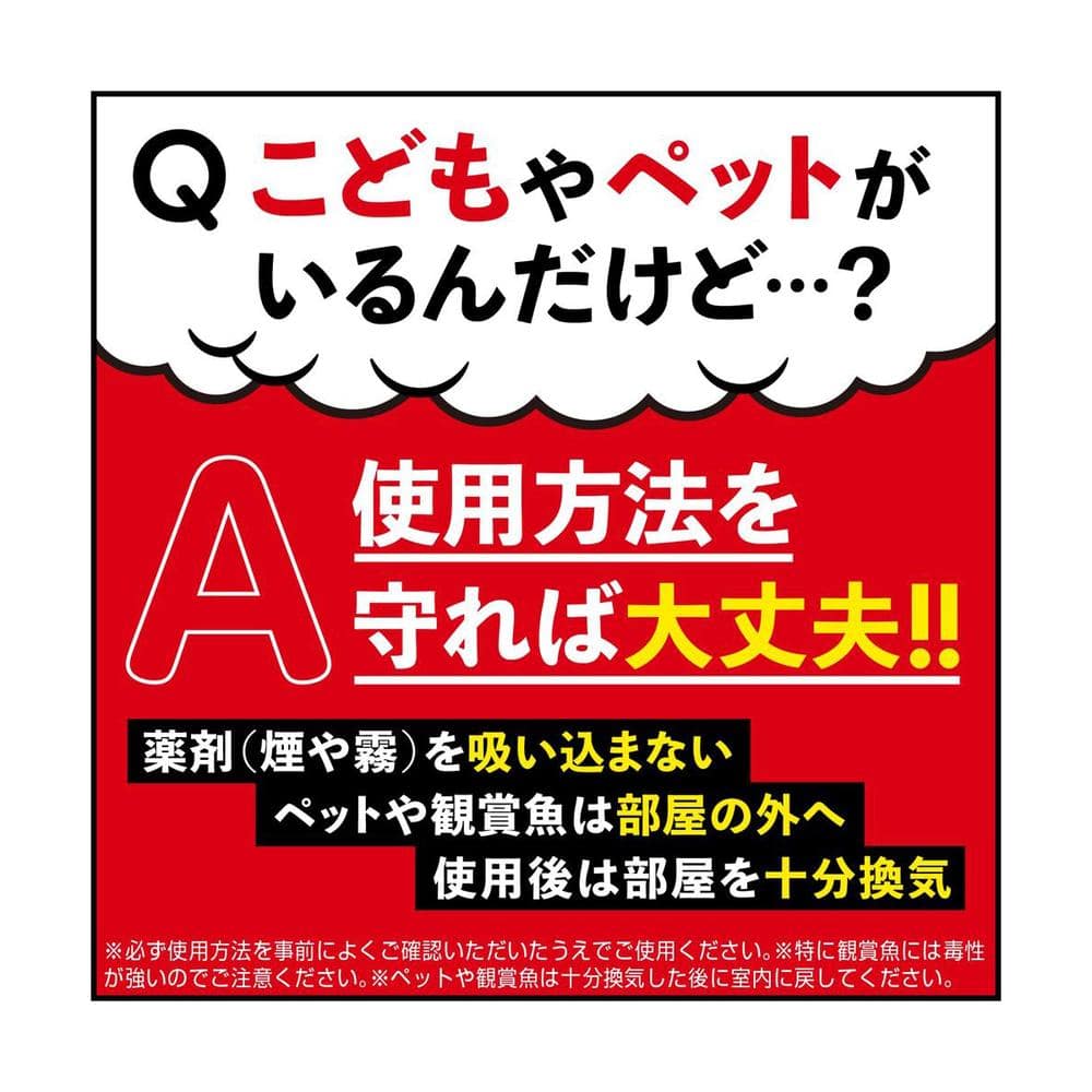【してはいけないこと】(守らないと副作用・事故が起こりやすくなります) ●人体に使用しないでください。 ●薬剤を吸い込まないように注意してください。万一吸い込んだ場合、咳き込み、のど痛、頭痛、気分不快等を生じることがあります。特にアレルギー症状やかぶれなどを起こしやすい体質の人、病人、妊婦、子供は薬剤を吸い込んだり、触れたりしないでください。 ●退出後、必ず2時間以上経過してから入室してください。換気のために入室するとき、刺激に敏感な人は薬剤を吸い込むと激しく咳き込み、嘔吐したり、呼吸が苦しくなることがあります。必ず、タオルなどで口や鼻を押さえて薬剤を吸い込まないようにしてください。アレルギー症状やかぶれを起こしやすい体質の人などは、特に注意をしてください。 ●使用する部屋や家屋から薬剤が漏れないように注意してください。漏れた薬剤を吸入すると上記のような症状になることがあります。 ●缶をセットしたら、すみやかに部屋の外に出て、戸を閉めてください。 ●缶は水に浸すとすぐに熱くなるので、直接手を触れないでください。ヤケドをする恐れがあります。 ●使用後は、部屋を十分に換気してから入室してください。 【相談すること】 ●万一身体に異常が起きた場合は、直ちに添付の説明文書を持って本品がピレスロイド系薬剤とオキサジアゾール系薬剤の混合剤であることを医師に告げて、診療を受けてください。 【その他の注意】 ●定められた使用方法・使用量を守ってください。 ●皮膚、目など人体にかからないようにしてください。薬剤が皮膚についた場合は、石けんと水でよく洗ってください。また、目に入った場合は、直ちに水でよく洗い流してください。 ●火災報知器が作動することがあります。火災報知器の直下では使用せず、一時的に添付の専用カバーまたはポリ袋などで覆いをして使用してください。その際、火気の管理には十分注意し、処理後は必ず覆いを取り除いてください。 ●飲食物、食器、子供のおもちゃ、飼料、美術品、仏壇仏具などに薬剤がかからないようにしてください。 ●小鳥などのペット類、観賞植物は換気するまで部屋の外に出してください。また、観賞魚や観賞エビはエアーポンプを止めて完全密閉(水槽に覆いをして、ガムテープなどで密閉する)にして使用するか、部屋の外に出してください。使用後十分に換気をした後、ビニールを取り、エアーポンプを動かしてください。室外に出した水槽は、使用後十分に換気をした後で元に戻してください。 ●はがね製品、銅やシンチュウ製のものは変色することがあるので、覆いをするか部屋の外に出してください。 ●故障の原因となるので、パソコン、テレビ、ゲーム機器、オーディオ・ビデオ製品などの精密機器にはカバーをかけ、テープ、ディスクなどは箱に収納してください。(大型コンピュータの設置されている部屋では使用しないでください。) ●はく製、毛皮、和服(金糸、銀糸の入ったもの)、衣類などは、変色したりシミになることがあるので、ポリ袋に入れるか覆いをするなどして、直接薬剤がかからないようにしてください。 ●本品は、ふとんなど寝具の害虫駆除には使用しないでください。 ●使用後は、小さな虫の死骸などをとり除くため軽く掃除機掛けなどを行ってください。 ●アルミ袋を開封後はすぐにお使いください。 注意-人体に使用しないでください