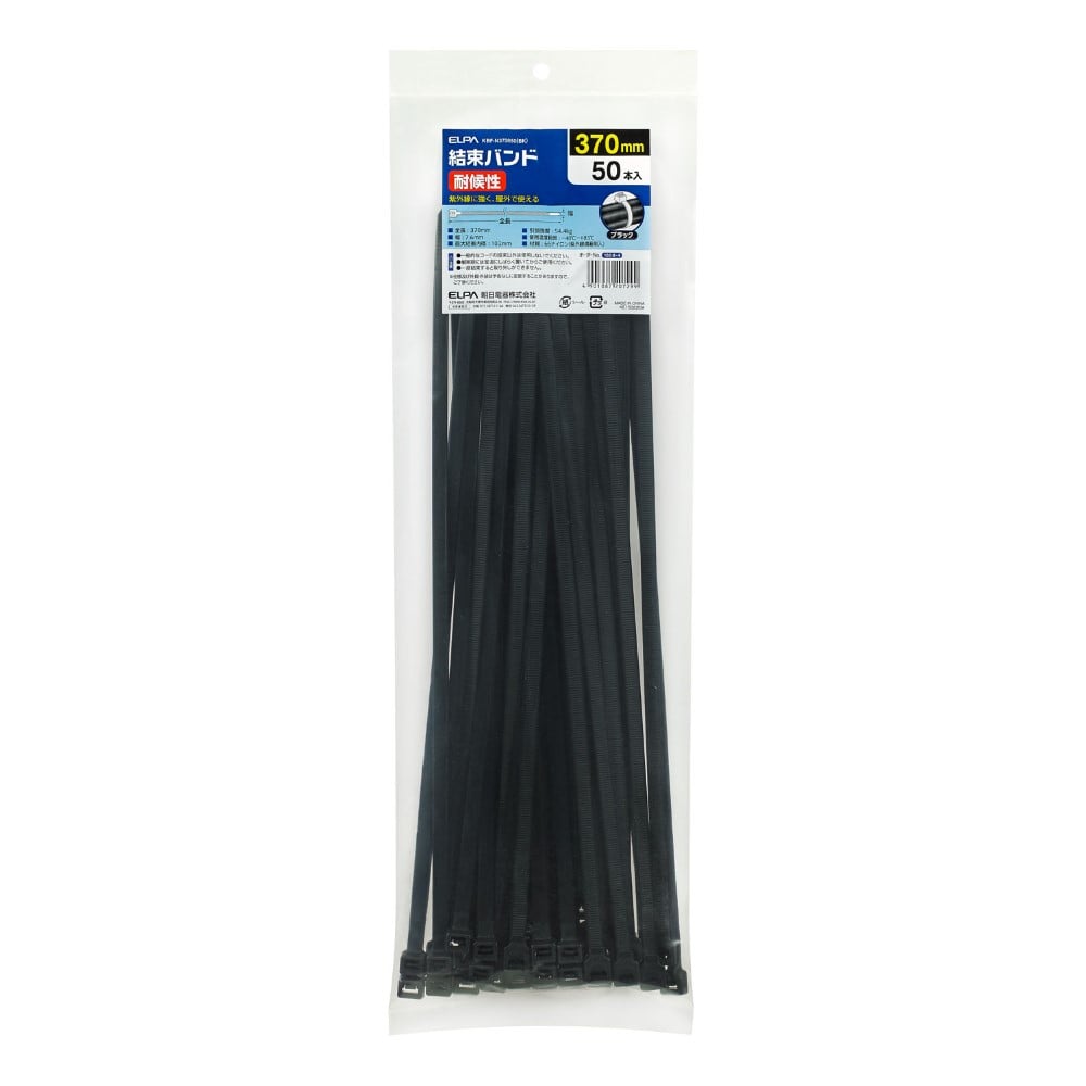 ●耐候性 ●紫外線に強く、屋外で使える■全長:370mm ■幅:7.6mm ■最大結束内径:102mm ■引張強度:55kgf ■使用温度範囲:-40度~+85度 ■材質:66ナイロン(紫外線遮蔽剤入) ■50本入 ■カラー:ブラック