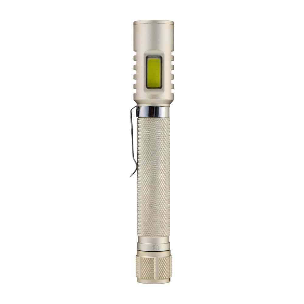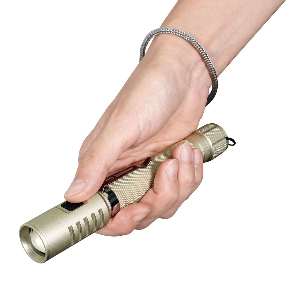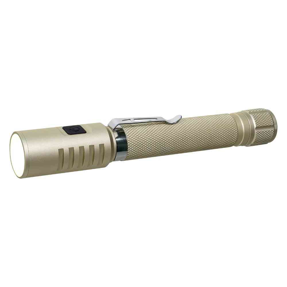 ●明るさ350lm ●防沫形IPX4 ●遠くと足元の2方向照射が可能なので散歩で活躍します ●光が均一で見やすい非球面レンズ ●ハンズフリーで手元を照らす ■使用電池:単三形アルカリ乾電池×2本(別売) ■連続点灯時間:全灯 約4時間 / LED(HI) 約4時間 / LED(LOW) 約22時間 / COB LED 約8時間 ※アルカリ乾電池使用時 ※電池の性能、使用条件により連続点灯時間は短くなる場合があります ■光源:白色LED×1灯+白色COB LED×1灯 ■明るさ:全灯 約350lm/ LED(HI) 約350lm/ LED(LOW) 約80lm/ COB LED 約100lm ※アルカリ乾電池初期時 ■外形寸法(約):直径26×全長166(mm)(ハンドストラップ・クリップ除く、最大値) ■質量:約98g(電池除く、ハンドストラップ・クリップ含む) ■防水仕様:IPX4(防沫形) ■付属品:ハンドストラップ