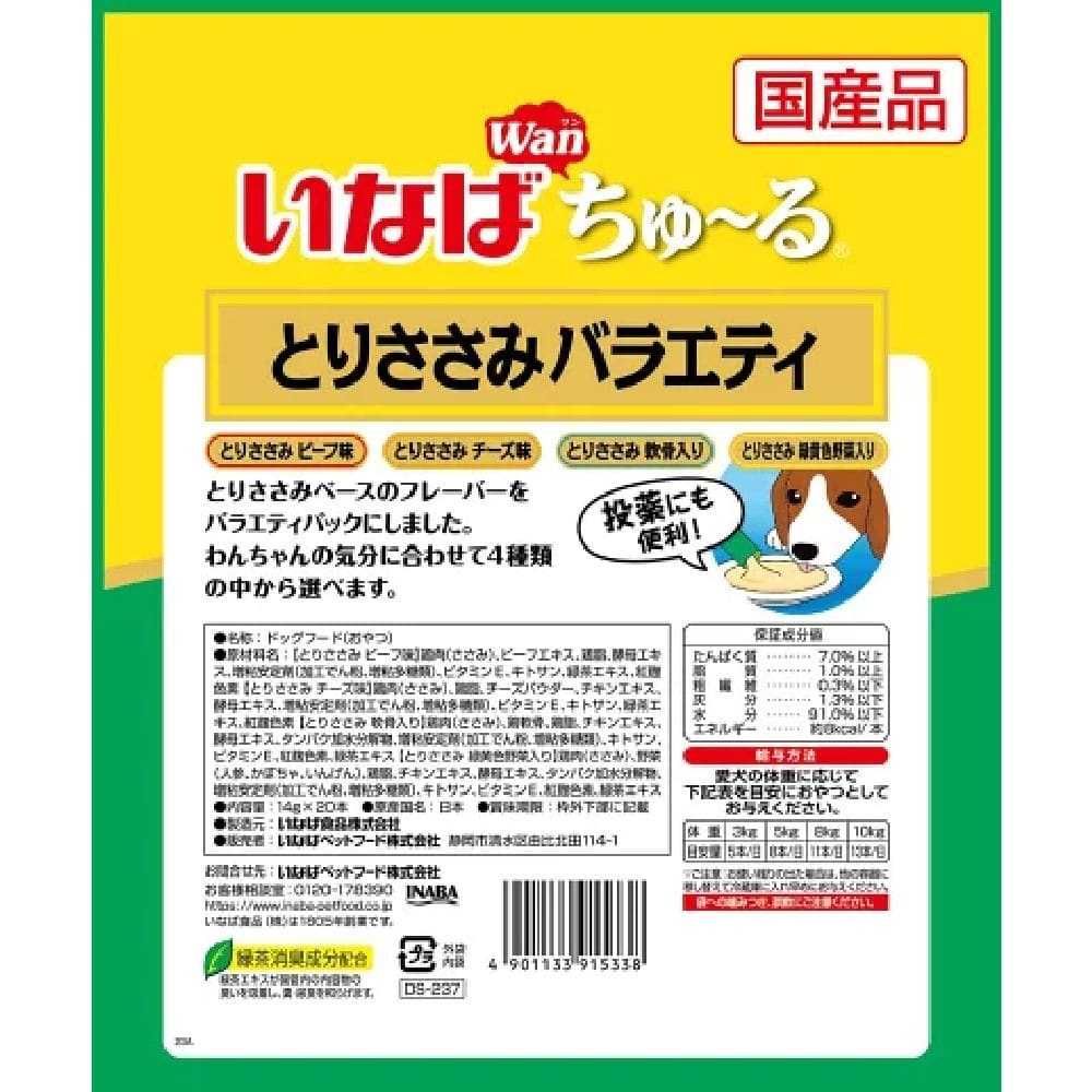 【とりささみビーフ味】鶏肉(ささみ)、ビーフエキス、鶏脂、酵母エキス、増粘安定剤(加工でん粉、増粘多糖類)、ビタミンE、キトサン、緑茶エキス、紅こうじ色素【とりささみチーズ味】鶏肉(ささみ)、鶏脂、チーズパウダー、チキンエキス、酵母エキス、増粘安定剤(加工でん粉、増粘多糖類)、ビタミンE、キトサン、緑茶エキス【とりささみ軟骨入り】鶏肉(ささみ)、鶏軟骨、鶏脂、チキンエキス、酵母エキス、タンパク加水分解物、増粘安定剤(加工でん粉、増粘多糖類)、キトサン、ビタミンE、紅こうじ色素、緑茶エキス【とりささみ緑黄色野菜入り】鶏肉(ささみ)、野菜(人参、かぼちゃ、いんげん)、鶏脂、チキンエキス、酵母エキス、タンパク加水分解物、増粘安定剤(加工でん粉、増粘多糖類)、キトサン、ビタミンE、紅こうじ色素、緑茶エキス