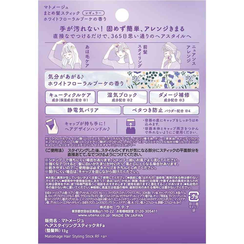あほ毛・前髪も固めずキープ。 手が汚れず、簡単にアレンジがきまるスティック型ワックス。 ナチュラル仕上げ。 ホワイトフローラルブーケの香り。