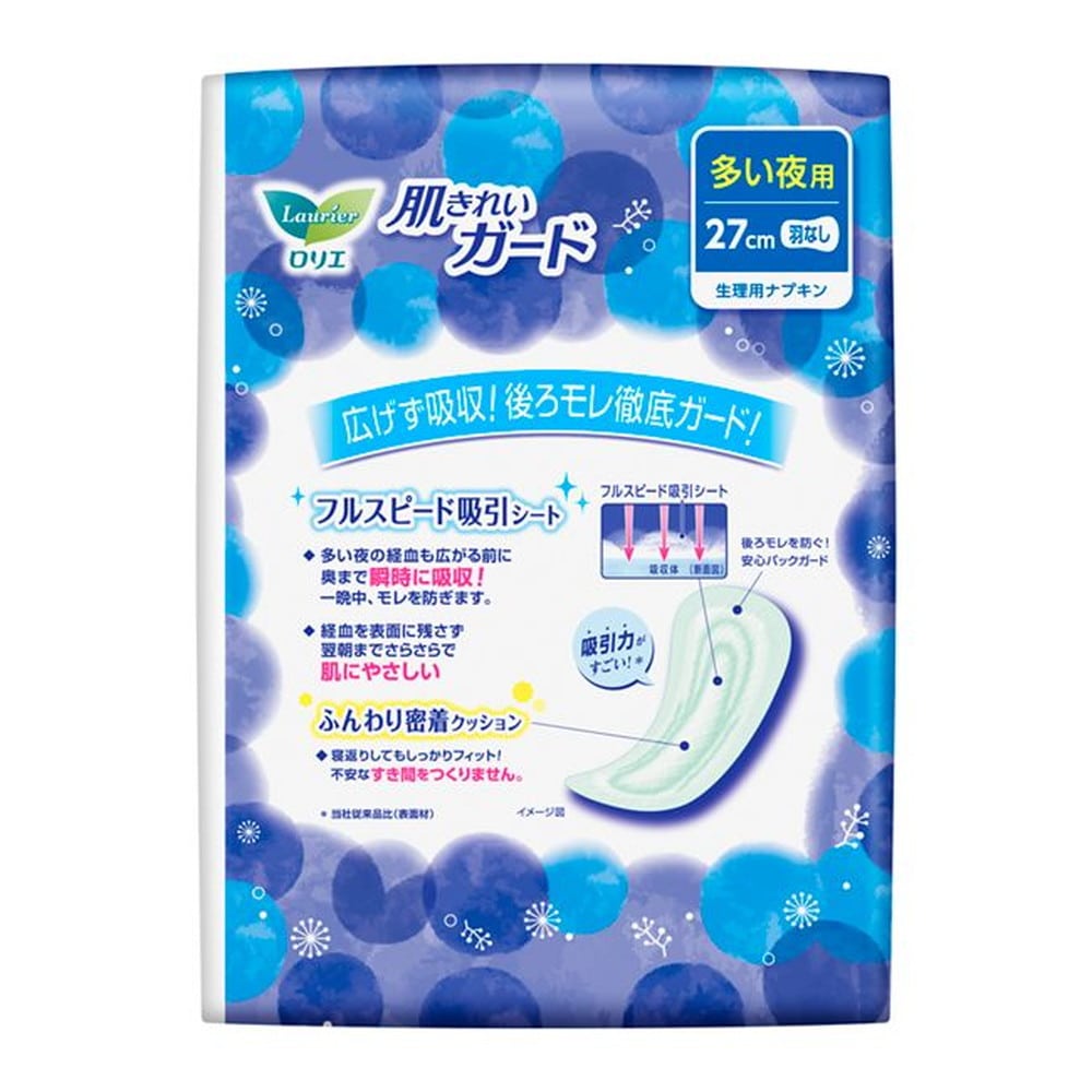 新・フルスピード吸引シートで、経血を表面に残さず翌朝までさらさら。 さらっと感UP※でさらに肌にやさしい♪多い夜の経血も広がる前に、奥まで瞬時に吸収!後ろモレ徹底ガード! ふんわり密着クッションで寝返りしてもしっかりフィット!不安なすき間をつくりません。(医薬部外品) ※当社従来品比