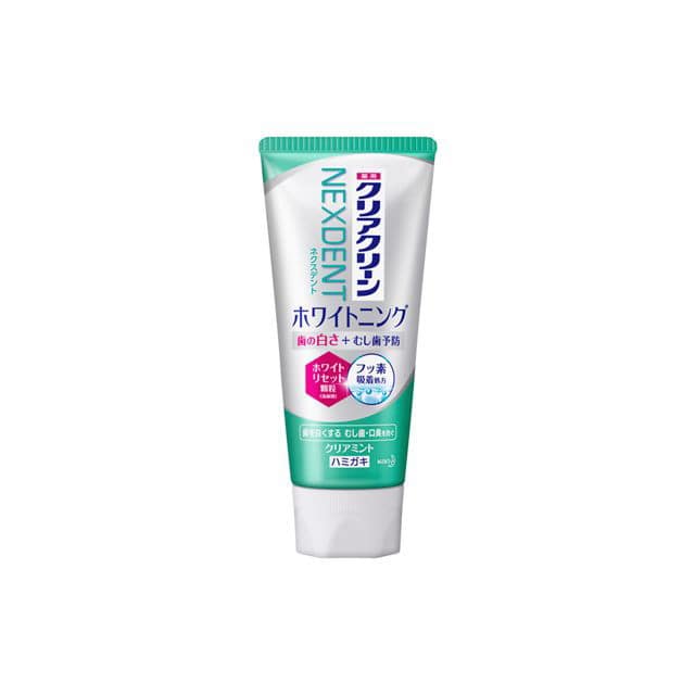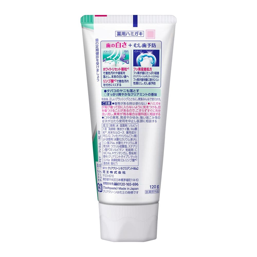 歯の白さ+むし歯予防。歯の白さ:ホワイトリセット顆粒(清掃剤)で着色汚れや歯垢を落とし、本来の白い歯へ。リンゴ酸(清掃助剤)で着色汚れを付きにくくする。むし歯予防:フッ素がたっぷり吸着する処方(クリアクリーンレギュラーハミガキ比)。フッ素が歯のエナメル質を酸に溶けにくい性質にし、むし歯予防。口臭予防。歯を白くする。タバコのヤニも落とす。すっきり爽やかなクリアミントの香味。【医薬部外品】
