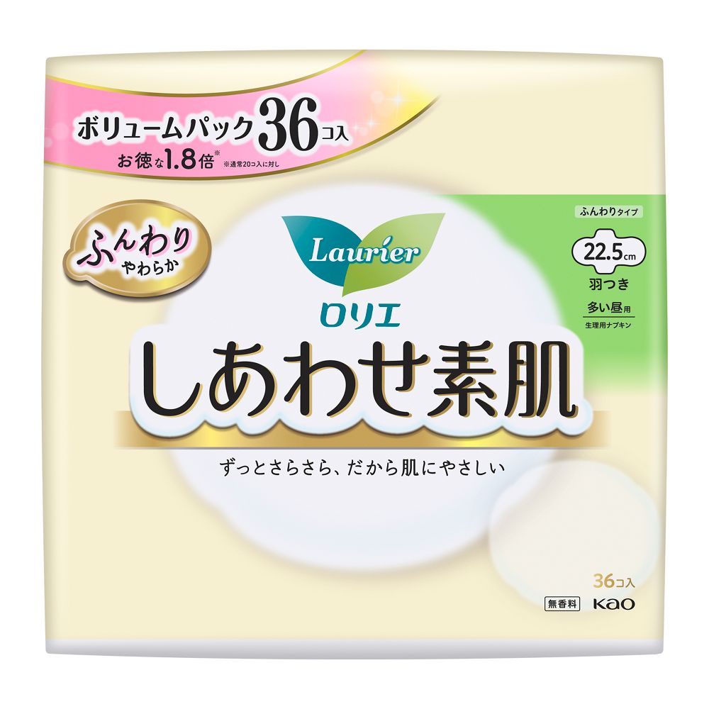 お徳な1.8倍※ ※通常20コ入に対し ボリュームパック36コ入 こだわりのふんわりやわらか仕立て Point1 低刺激タッチのワッフルシート*1 肌にあたる面が最小限だから*2、こすれにくい Point2 瞬間吸収 肌さらさら続く ドッと出ても素早くすーっと吸い込む 経血をしっかり吸収して、ベタつきにくい Point3 100%*3通気素材 ショーツ内のこもった空気を通すから、ムレにくい *1 従来品の「ふわポコ表面シート」と同一 *2 ロリエ生理用ナプキン内 *3 ズレ止めテープ部分除く