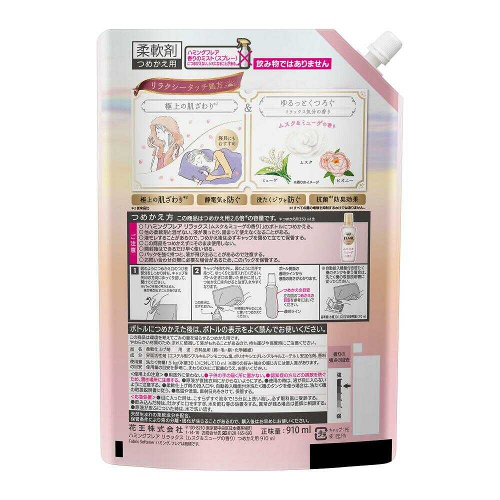 ○「ハミングフレア リラックス(ムスク&ミューゲの香り)」のボトルにつめかえる。 ○他の柔軟剤と混ぜない。液が濁ったり、固まって使えなくなることがある。 ○液モレすることがあるので、つめかえ後は必ずキャップを閉めて立てて保管する。 ○この商品をつめかえずにそのまま使用しない。 ○開封後はできるだけ早く使い切る。 ○パックを強く持つと、液が飛び出ることがあるので注意する。 ○お問い合わせの際に必要な場合があるため、このパックを保管する。 ●用途外に使わない。 ●子供の手の届く所に置かない。 ●認知症の方などの誤飲を防ぐため、置き場所に注意する。 ●原液が直接衣料にかからないようにする。 ●使用の時は、液が目に入らないように注意する。 ●柔軟仕上げ剤の投入口や、自動投入機能付き洗たく機のタンクを使う場合は、洗たく機の取扱説明書に従う。 ●高温や低温、直射日光をさけて、保管する。
