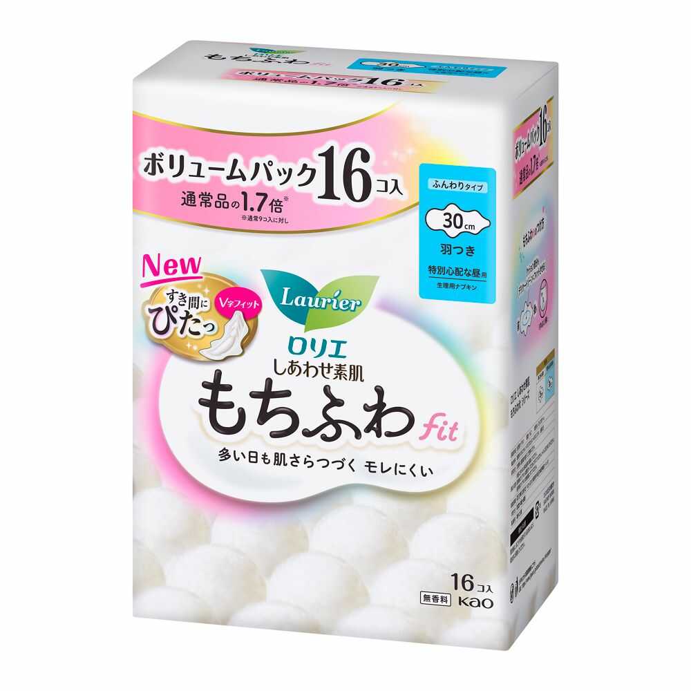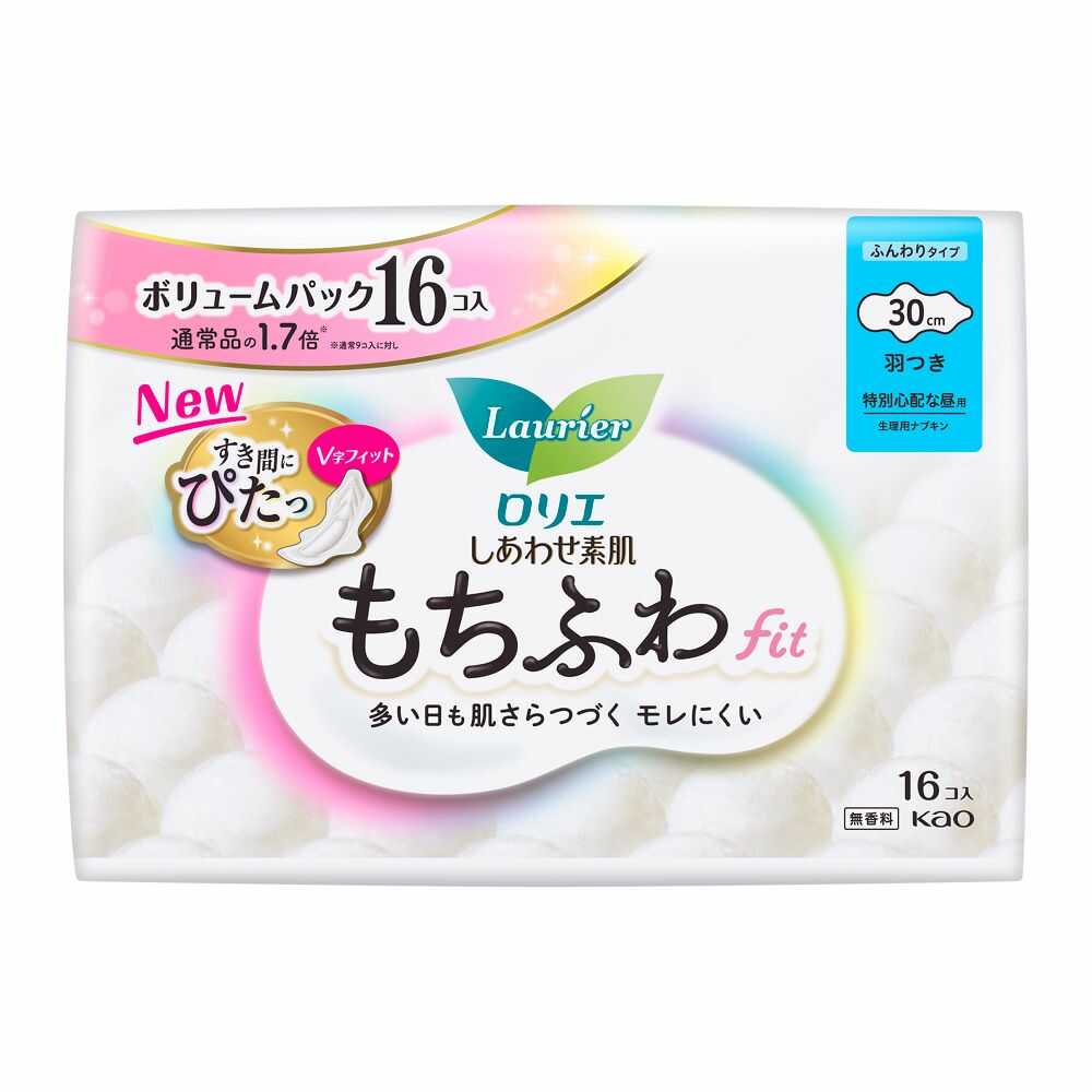 ロリエ、花王、しあわせ素肌、もちふわfit、もちふわフィット、ボリュームパック、特別心配な昼用、30cm、羽つき、V字フィット、ナプキン、生理用品、昼用