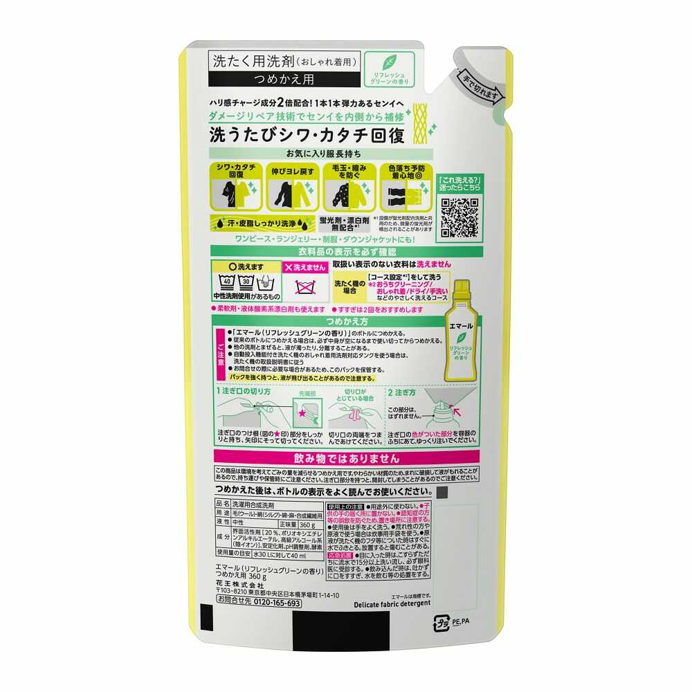 花王、エマール、おしゃれ着、おしゃれぎ、おしゃれ着洗い、洗剤、洗濯洗剤、ニット、リフレッシュグリーン、緑のエマール、つめかえ、詰替、大容量洗剤