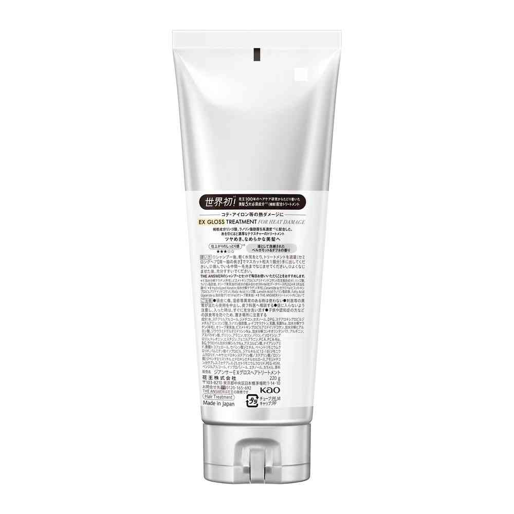 世界初*1! 花王100年のヘアケア研究からたどり着いた 美髪5大必須成分*2(補修)配合トリートメント コテ・アイロン等の熱ダメージに EX GLOSS TREATMENT FOR HEAT DAMAGE 補修成分リンゴ酸、ラノリン脂肪酸を高濃度*3に配合した、糸を引くほど濃厚なテクスチャーのトリートメント ツヤめき、なめらかな美髪へ 仕上がりのしっとり感*3 ★★★☆☆ 凛として洗練されたベルガモット&ダフネの香り
