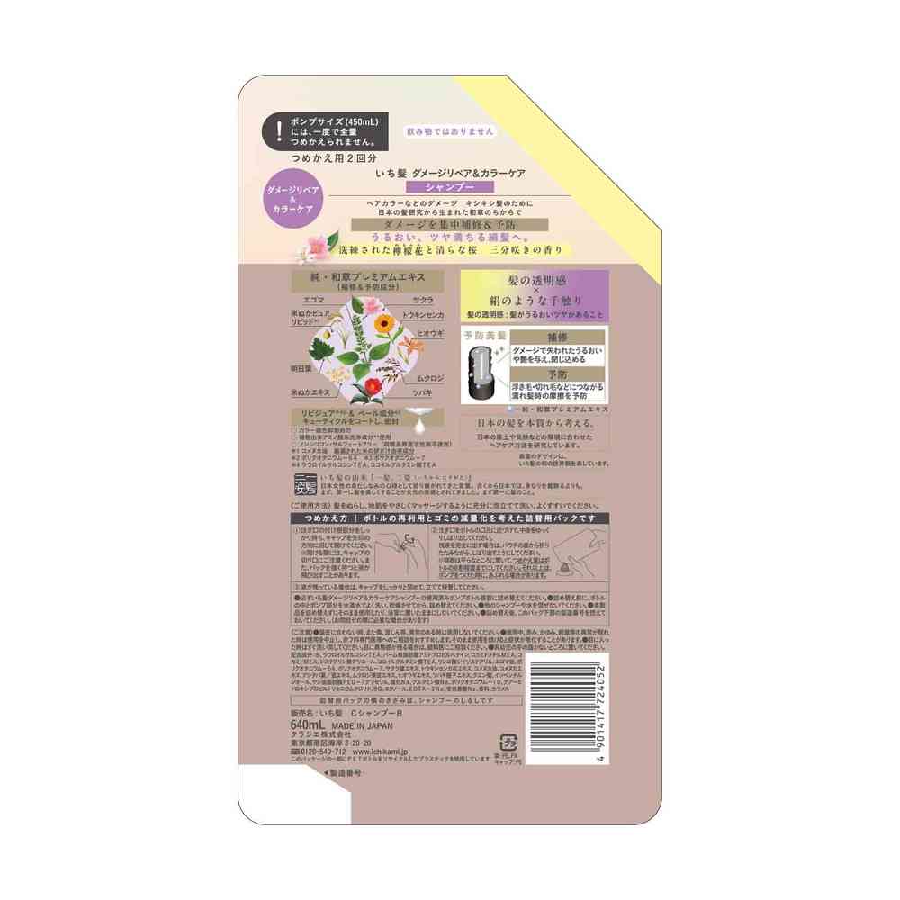 ●日本の髪研究から生まれた和草のちから、ダメージを集中補修+予防美髪ケアシリーズ ●髪の透明感と絹のような手触り ●補修&予防成分「純・和草プレミアムエキス」配合 ●キューティクルをコートし、密封する「リピジュアR&ベール成分」配合 ●カラー褪色抑制処方 ●植物由来アミノ酸系洗浄成分使用 ●ノンシリコン・サルフェートフリー処方 ●洗練された檸檬花と清らかな桜三分咲きの香り