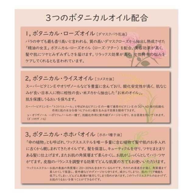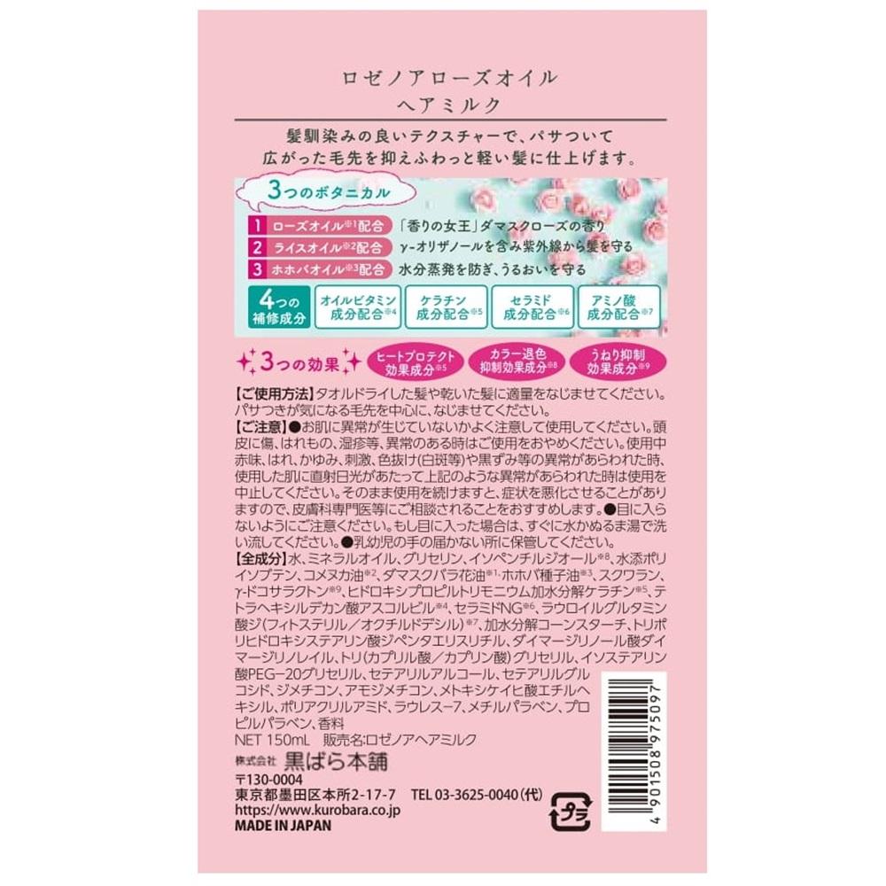 「香りの女王」ダマスクローズ配合。 パサついて広がった毛先を抑えふんわり軽い髪に仕上げます。 3つの効果(ヒートプロテクト効果、カラー退色抑制効果、うねり抑制効果)で女性の悩みを解決します。 しっとりまとまるツヤ髪に仕上げるヘアミルク。 乾燥によってまとまりにくくなった髪にケラチン&ビタミンが吸着し、うるおいとツヤを与えます。 ローズの香り。 ロゼノアローズオイルヘアミルク
