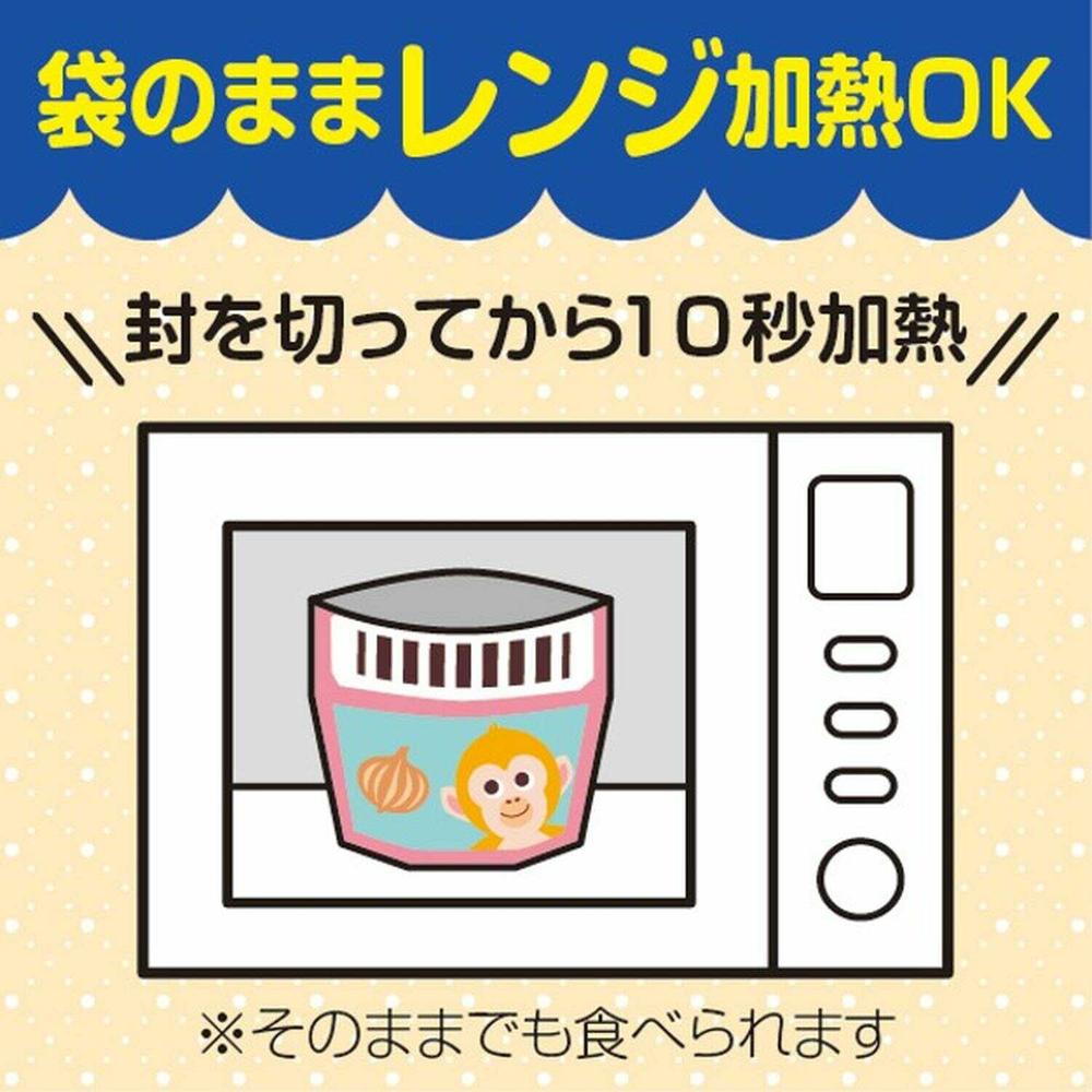 ▲700W以上の高出力電子レンジではワット数を下げて加熱してください。 ▲加熱手順、条件をお守りください。 ▲温めた後に、中身がはねてヤケドをする恐れがありますのでご注意ください。 ▲ヤケドをしないようにお子さまにあげる前に温度をお確かめください。 開封時、液はね注意 オート加熱不可 ヤケド注意 切りくち注意