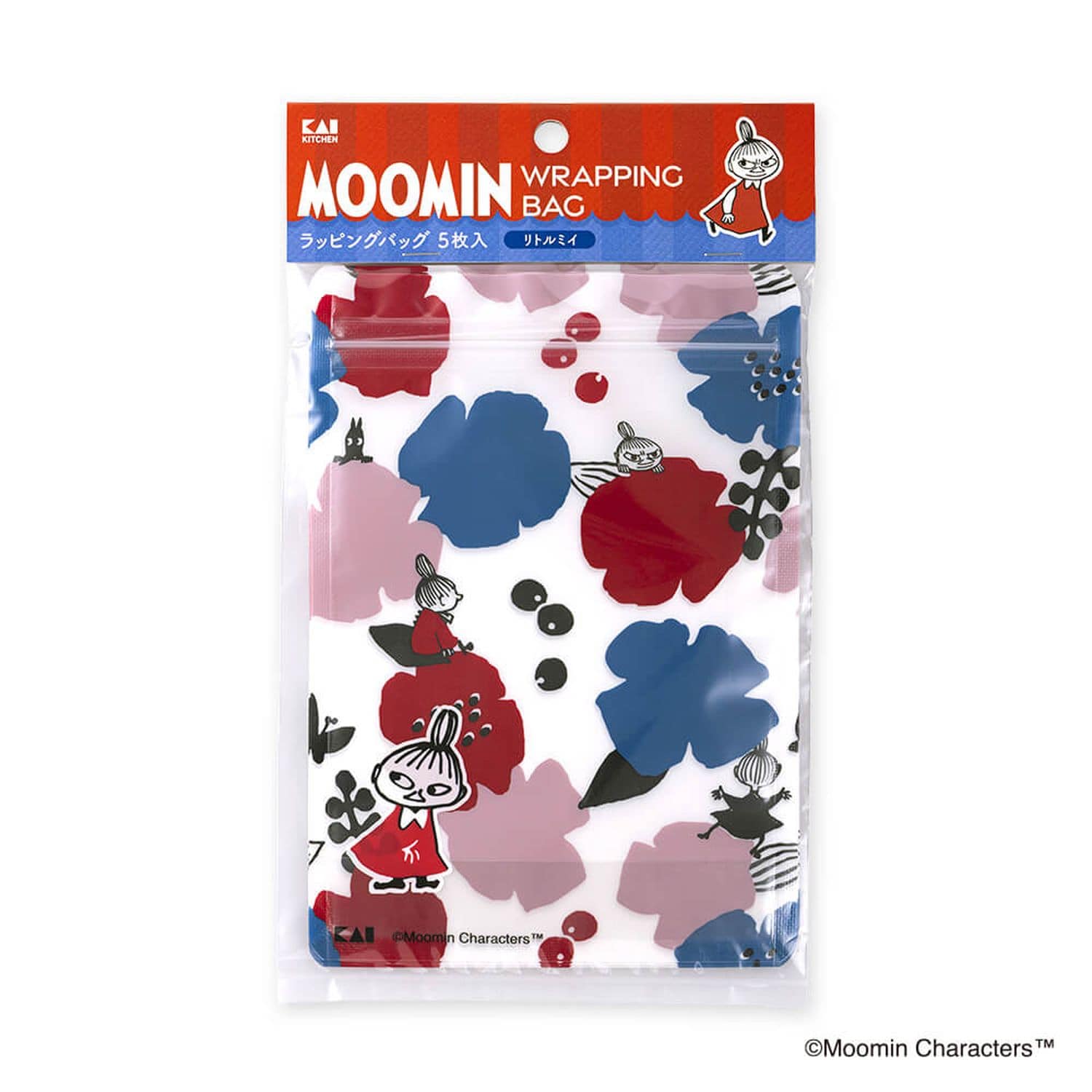 ムーミンと貝印がコラボした製菓用品シリーズ。お花にリトルミイが隠れたジップ付きのラッピングバッグ。左下のリトルミイは中身の手前にくるの中に物を入れても見えるワンポイントが可愛いデザインです。ギフトだけでなく小物入れとしても使えます。<仕様>同柄5枚入り●耐冷温度:0度