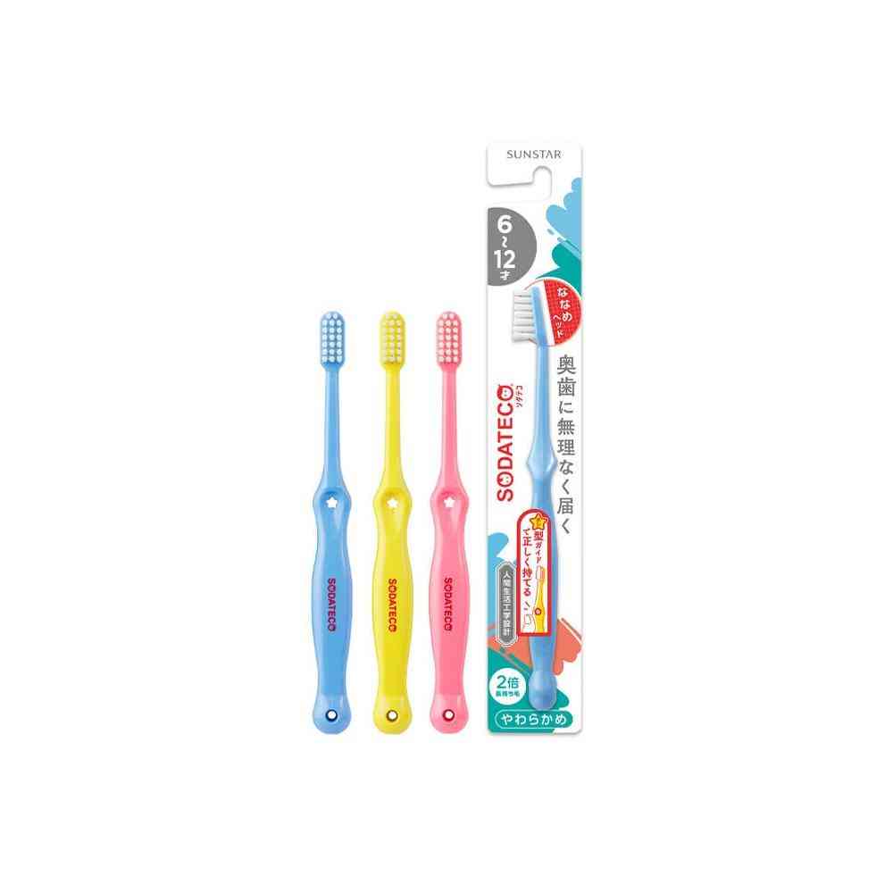星型ガイドで親指を置く位置がわかりやすく、自然に正しい持ち方ができる人間生活工学に基づいたハンドル設計。 奥歯もしっかりみがけるななめヘッドを採用でお子さまの歯みがき習慣をサポート。 やわらかいのに毛がひらきにくい「長持ちハブラシ毛」採用。 対象年齢:6-12才