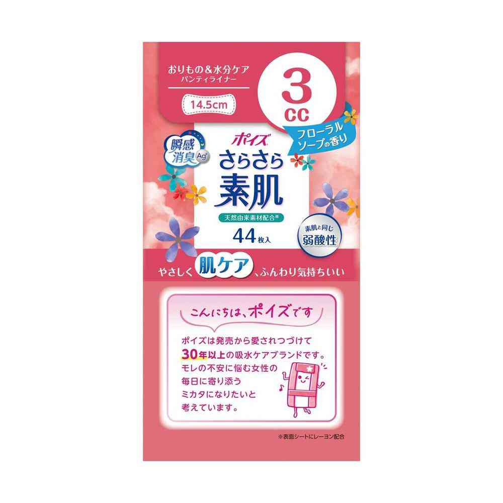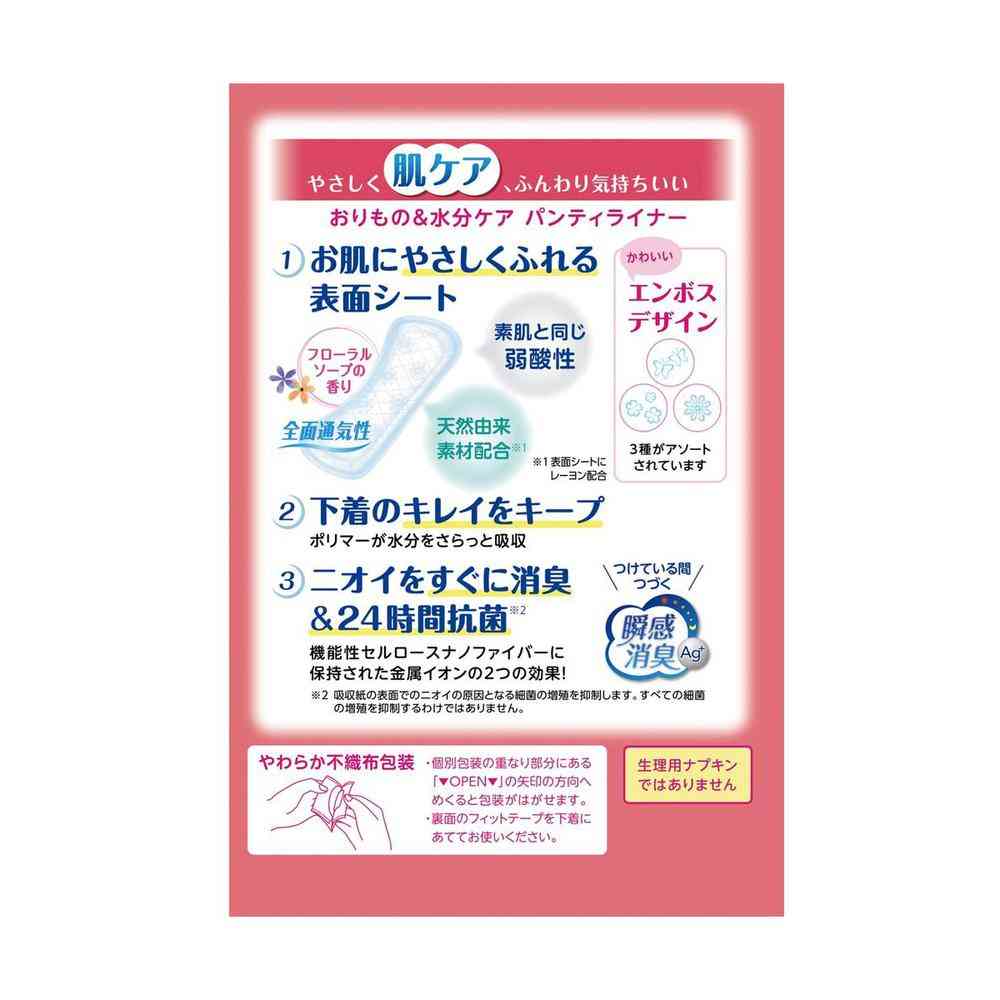 ・表面シートに天然由来素材のレーヨンを配合 ・素肌と同じ弱酸性 ・ポリマーが水分をさらっと吸収し、下着のキレイをキープ ・ニオイをすぐに消臭&24時間抗菌 ・ムレにくい全面通気性 ・フローラルソープの香り ・吸収量の目安:3cc ・パッドサイズ:長さ14.5cm