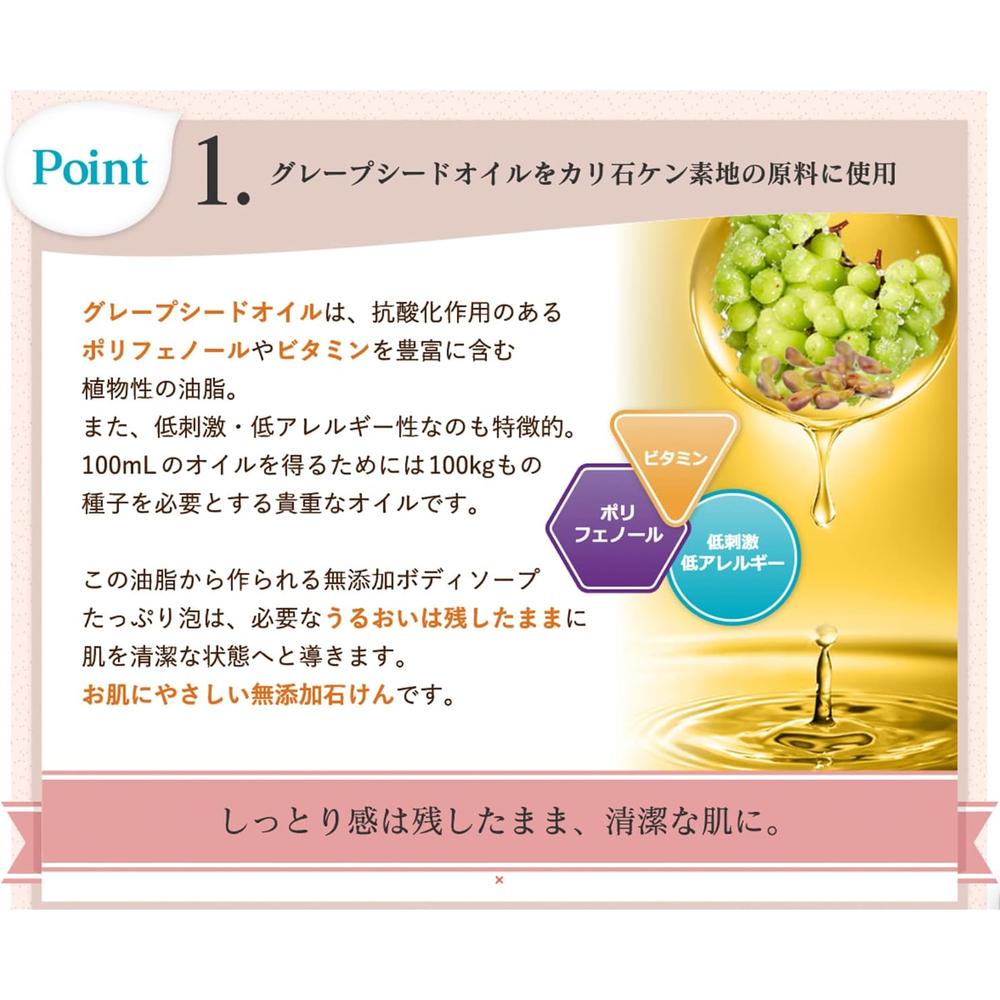 グレープシードオイル(ブドウ種子油)などの天然油脂を原料に使用し、釜炊き製法(ケン化法)でじっくり炊く上げて作りました。 香料・着色料・酸化防止剤・合成界面活性剤不使用の無添加石けんです。 3ml吐出のたっぷり泡で手のひら洗いしやすくなりました。