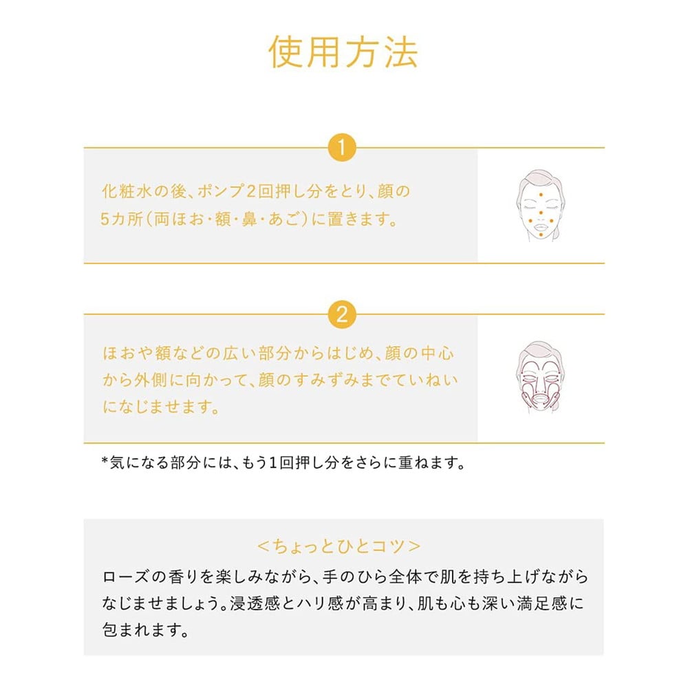 ●<美容液> ●アレルギーテスト済 ●一気に届けてハリつや肌へ導く、美容液です。 ●エイジングケアのための発酵ローヤルゼリーGL(ローヤルゼリー発酵液、グリセリン)高配合。 ●角層の奥までリッチなうるおいを一気に届け、なじませた瞬間からたっぷりうるおって若わかしいハリとつやあふれる肌に導きます。 【使用方法】 ●朝夜の化粧水の後、ポンプ2回押し分をとり、なじませます。気になる部分には、もう1回押し分をさらに重ねます。 【香り】 ローズミストのほのかな香り