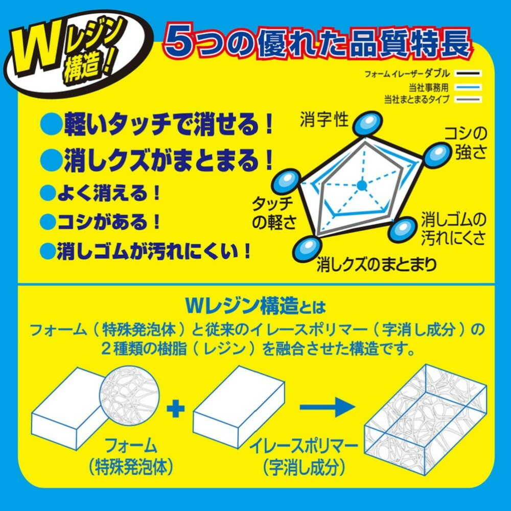 ●フォーム(特殊発泡体)とイレースポリマー(字消し成分)のWレジン構造です。 ●タッチが軽いです。 ●消しクズがまとまります。 ●よく消えます。 ●コシがあります。 ●消しゴムが汚れにくいです。