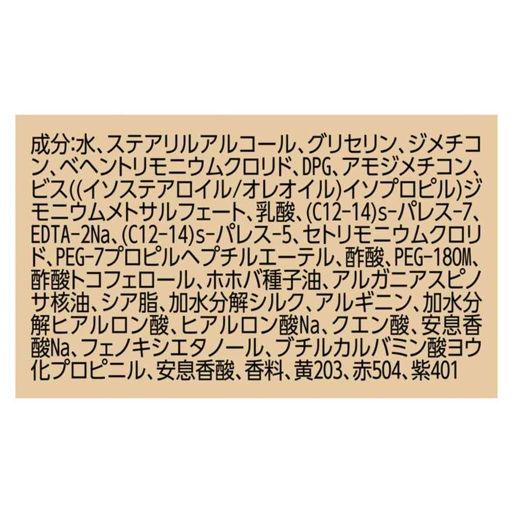 水、ステアリルアルコール、グリセリン、ジメチコン、ベヘントリモニウムクロリド、DPG、アモジメチコン、ビス((イソステアロイル/オレオイル)イソプロピル)ジモニウムメトサルフェート、乳酸、(C12-14)s-パレス-7、EDTA-2Na、(C12-14)s-パレス-5、セトリモニウムクロリド、PEG-7プロピルヘプチルエーテル、酢酸、PEG-180M、酢酸トコフェロール、ホホバ種子油、アルガニアスピノサ核油、シア脂、加水分解シルク、アルギニン、加水分解ヒアルロン酸、ヒアルロン酸Na、クエン酸、安息香酸Na、フェノキシエタノール、ブチルカルバミン酸ヨウ化プロピニル、安息香酸、香料、黄203、赤504、紫401
