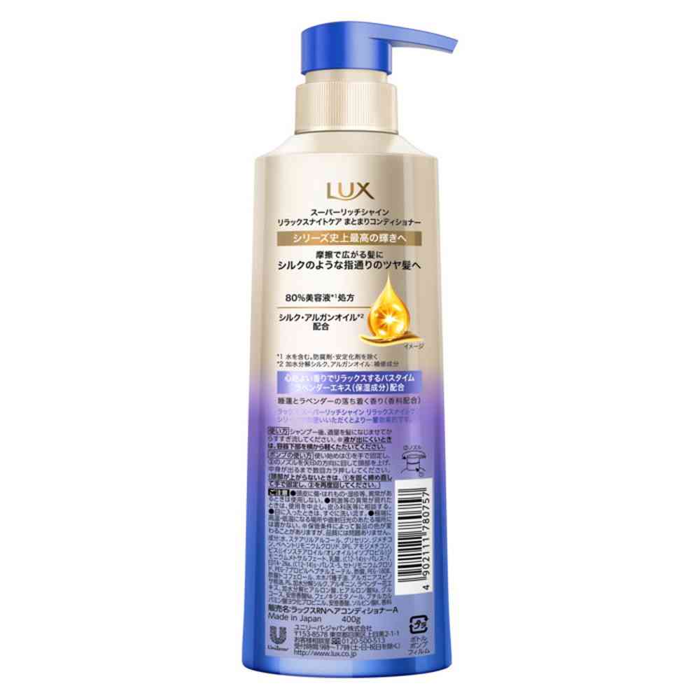 水、ステアリルアルコール、グリセリン、ジメチコン、ベヘントリモニウムクロリド、DPG、アモジメチコン、ビス((イソステアロイル/オレオイル)イソプロピル)ジモニウムメトサルフェート、乳酸、(C12-14)s-パレス-7、EDTA-2Na、(C12-14)s-パレス-5、セトリモニウムクロリド、PEG-7プロピルヘプチルエーテル、酢酸、PEG-180M、酢酸トコフェロール、ホホバ種子油、アルガニアスピノサ核油、PG、加水分解シルク、アルギニン、ラベンダー花エキス、加水分解ヒアルロン酸、ヒアルロン酸Na、グルコース、安息香酸Na、フェノキシエタノール、ブチルカルバミン酸ヨウ化プロピニル、安息香酸、ソルビン酸K、香料