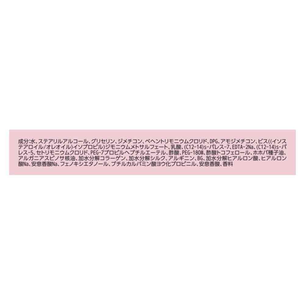 水、ステアリルアルコール、グリセリン、ジメチコン、ベヘントリモニウムクロリド、DPG、アモジメチコン、ビス((イソステアロイル/オレオイル)イソプロピル)ジモニウムメトサルフェート、乳酸、(C12-14)s-パレス-7、EDTA-2Na、(C12-14)s-パレス-5、セトリモニウムクロリド、PEG-7プロピルヘプチルエーテル、酢酸、PEG-180M、酢酸トコフェロール、ホホバ種子油、アルガニアスピノサ核油、加水分解コラーゲン、加水分解シルク、アルギニン、BG、加水分解ヒアルロン酸、ヒアルロン酸Na、安息香酸Na、フェノキシエタノール、ブチルカルバミン酸ヨウ化プロピニル、安息香酸、香料