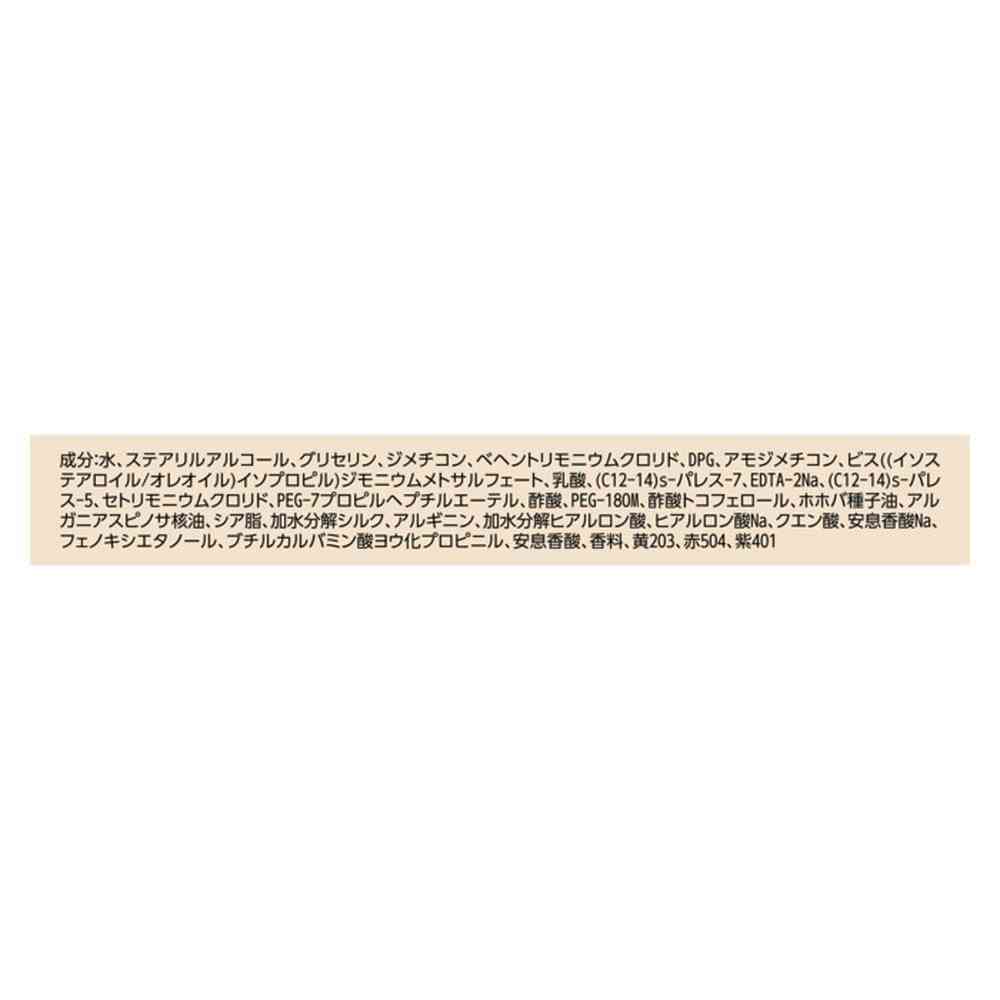 水、ステアリルアルコール、グリセリン、ジメチコン、ベヘントリモニウムクロリド、DPG、アモジメチコン、ビス((イソステアロイル/オレオイル)イソプロピル)ジモニウムメトサルフェート、乳酸、(C12-14)s-パレス-7、EDTA-2Na、(C12-14)s-パレス-5、セトリモニウムクロリド、PEG-7プロピルヘプチルエーテル、酢酸、PEG-180M、酢酸トコフェロール、ホホバ種子油、アルガニアスピノサ核油、シア脂、加水分解シルク、アルギニン、加水分解ヒアルロン酸、ヒアルロン酸Na、クエン酸、安息香酸Na、フェノキシエタノール、ブチルカルバミン酸ヨウ化プロピニル、安息香酸、香料、黄203、赤504、紫401