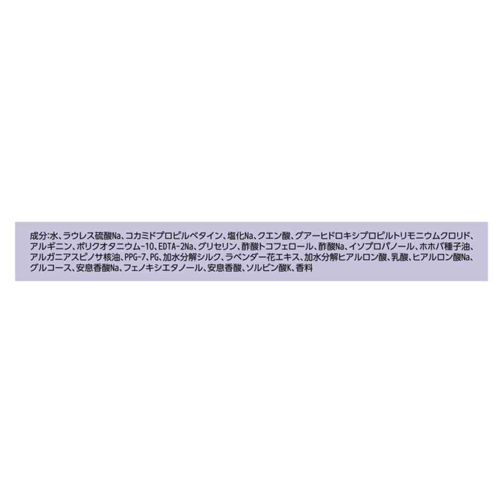 水、ラウレス硫酸Na、コカミドプロピルベタイン、塩化Na、クエン酸、グアーヒドロキシプロピルトリモニウムクロリド、アルギニン、ポリクオタニウム-10、EDTA-2Na、グリセリン、酢酸トコフェロール、酢酸Na、イソプロパノール、ホホバ種子油、アルガニアスピノサ核油、PPG-7、PG、加水分解シルク、ラベンダー花エキス、加水分解ヒアルロン酸、乳酸、ヒアルロン酸Na、グルコース、安息香酸Na、フェノキシエタノール、安息香酸、ソルビン酸K、香料