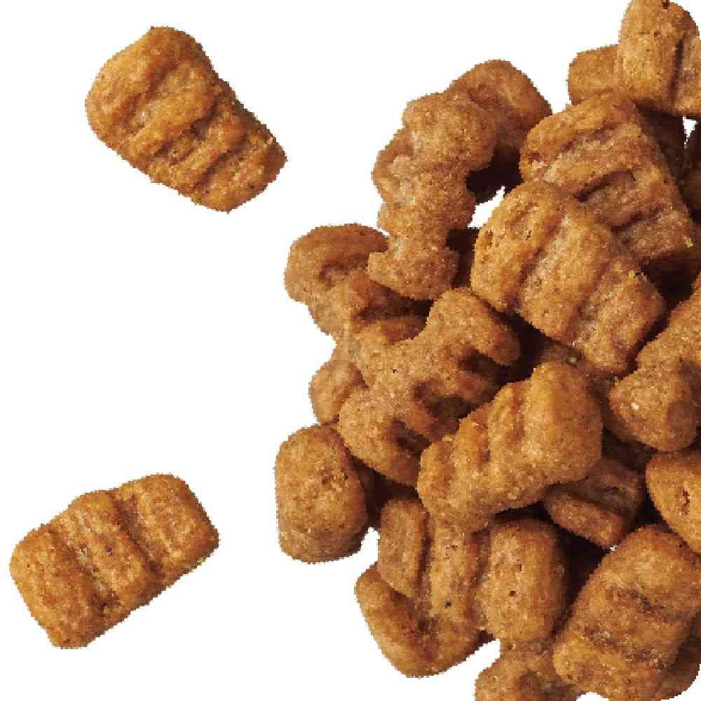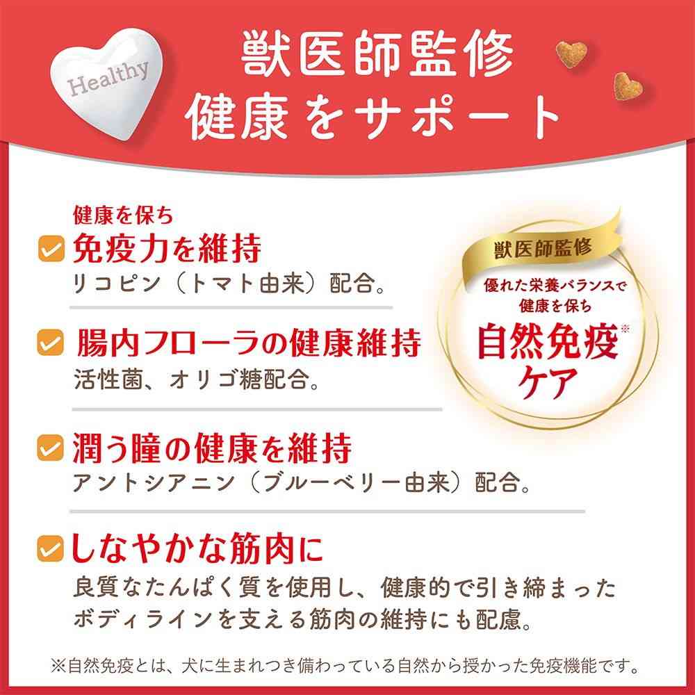 穀類(トウモロコシ、コーングルテンミール、小麦ブラン、小麦粉、ライスブラン)、肉類(チキンミール、チキンレバーパウダー)、油脂類(動物性油脂、植物性油脂(オメガ-6脂肪酸含む))、魚介類(フィッシュエキスパウダー、マリンコラーゲン、小魚粉末(DHA、EPA/オメガ-3脂肪酸源))、ビール酵母(β-グルカン源)、卵黄粉末(グロビゲンPG)、乳酸菌加熱菌体、糖類(オリゴ糖、エリスリトール)、カゼインホスホペプチド、果実類(クランベリーパウダー、ブルーベリーパウダー(アントシアニン源))、トマト(リコピン源)、L-カルニチン、ミネラル類(カルシウム、リン、カリウム、クロライド、鉄、銅、マンガン、グルコン酸亜鉛、硫酸亜鉛、ヨウ素、コバルト)、ビタミン類(A、B2、B6、B12、D、E、パントテン酸、コリン)、バチルスサブチルス(活性菌)、酸化防止剤(ミックストコフェロール、ローズマリー抽出物)、アミノ酸類(アルギニン、タウリン、メチオニン)、グルコサミン、コンドロイチン、ヒアルロン酸 たんぱく質25.0%以上、脂質12.0%以上、粗繊維3.0%以下、灰分8.5%以下、水分10.0%以下、カルシウム1.0%以上、リン0.8%以上、リノール酸1.5%以上、ビタミンA 550IU/100g以上、ビタミンE 10.0IU/100g以上、ビタミンB1 0.2mg/100g以上、ビタミンB2 0.3mg/100g以上、ビタミンB6 0.4mg/100g以上、ビタミンB12 0.003mg/100g以上