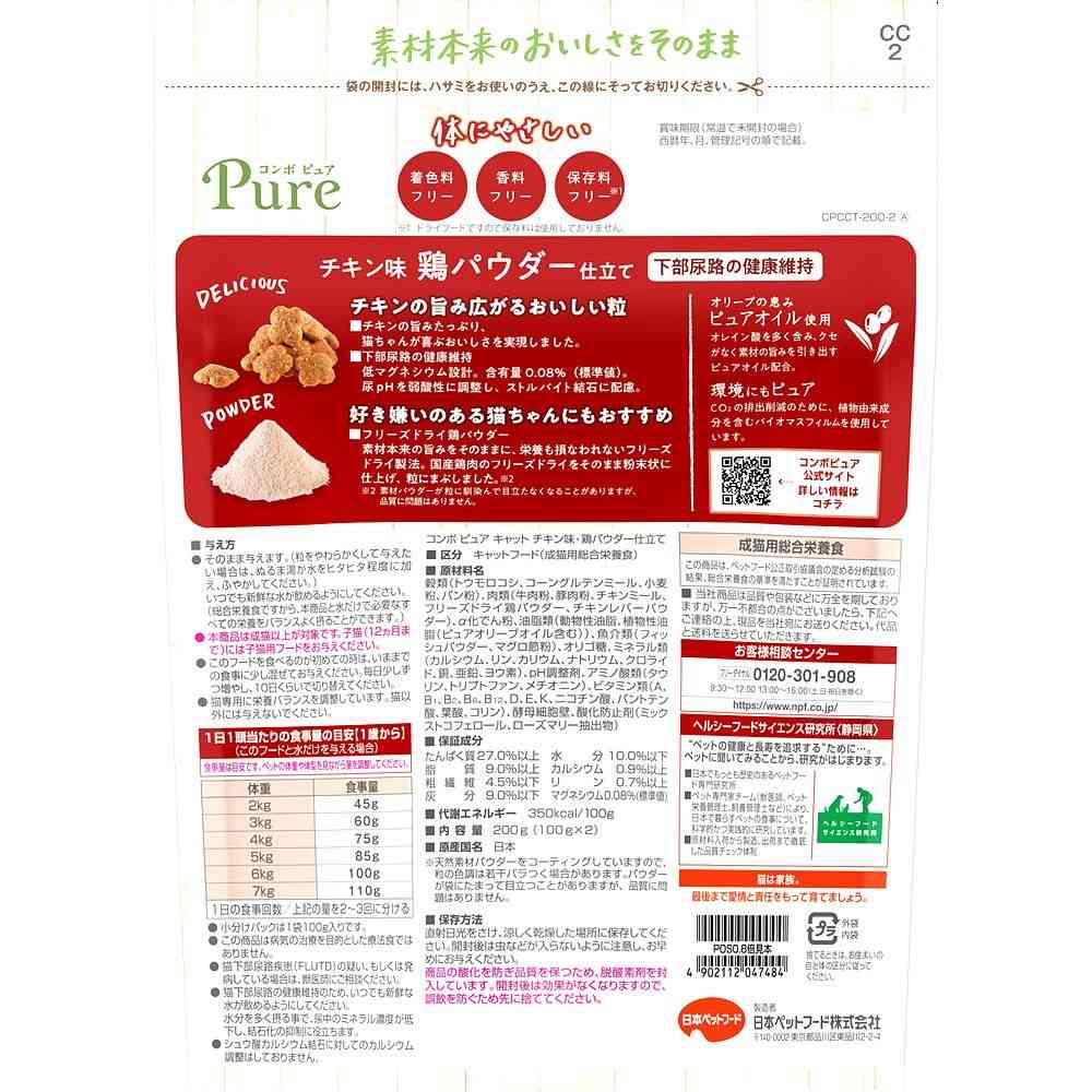 穀類(トウモロコシ、コーングルテンミール、小麦粉、パン粉)、肉類(牛肉粉、豚肉粉、チキンミール、フリーズドライ鶏パウダー、チキンレバーパウダー)、α化でん粉、油脂類(動物性油脂、植物性油脂(ピュアオリーブオイル含む))、魚介類(フィッシュパウダー、マグロ節粉)、オリゴ糖、ミネラル類(カルシウム、リン、カリウム、ナトリウム、クロライド、銅、亜鉛、ヨウ素)、pH調整剤、アミノ酸類(タウリン、トリプトファン、メチオニン)、ビタミン類(A、B1、B2、B6、B12、D、E、K、ニコチン酸、パントテン酸、葉酸、コリン)、酵母細胞壁、酸化防止剤(ミックストコフェロール、ローズマリー抽出物) たんぱく質27.0%以上、脂質9.0%以上、粗繊維4.5%以下、灰分9.0%以下、水分10.0%以下、カルシウム0.9%以上、リン0.7%以上、マグネシウム0.08%(標準値)