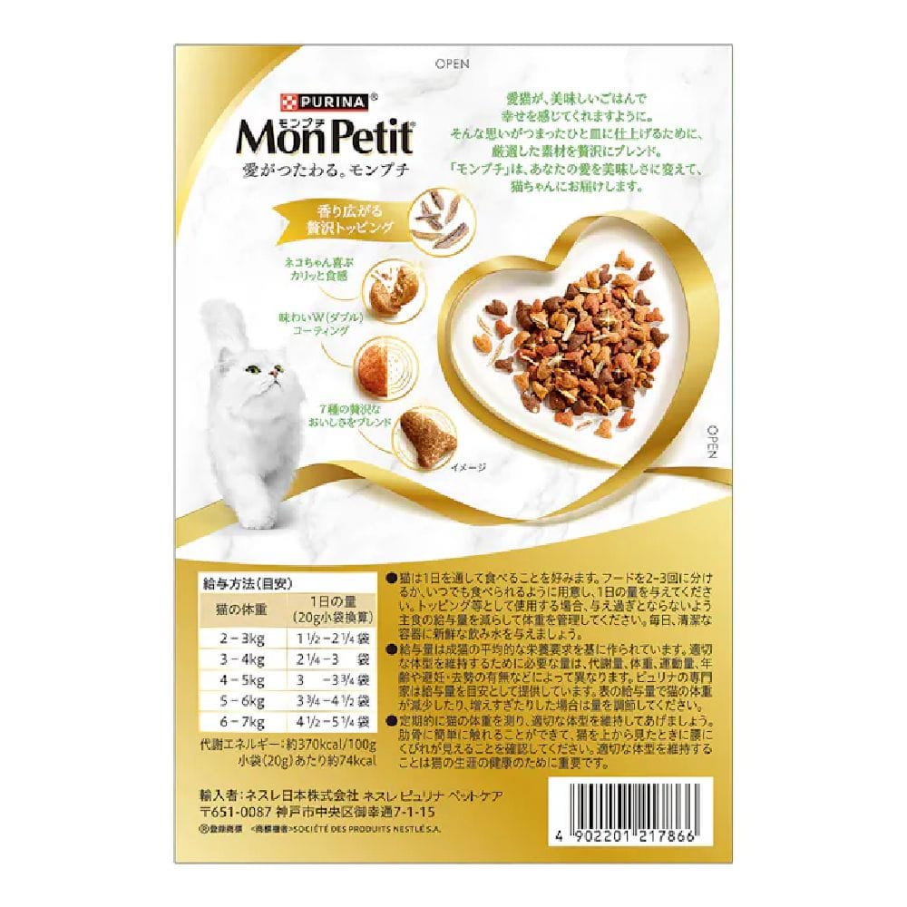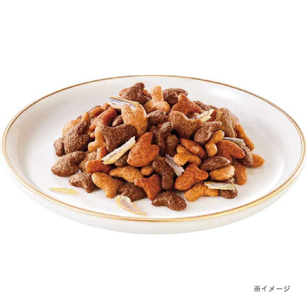 穀類(とうもろこし、とうもろこしたんぱく、小麦、米等)、肉類(チキンミール等)、動物性油脂、魚介類(まぐろ、かつお、小魚)、たんぱく加水分解物、フレーバーブレンド(鯛、サーモン、かに、サーディン、えび等)、ミネラル類(カルシウム、リン、カリウム、ナトリウム、クロライド、鉄、銅、マンガン、亜鉛、ヨウ素、セレン)、ビタミン類(A、E、K、B1、B2、パントテン酸、ナイアシン、B6、葉酸、ビオチン、B12、コリン)、アミノ酸類(メチオニン、タウリン)、着色料(カラメル色素、カロテノイド色素)
