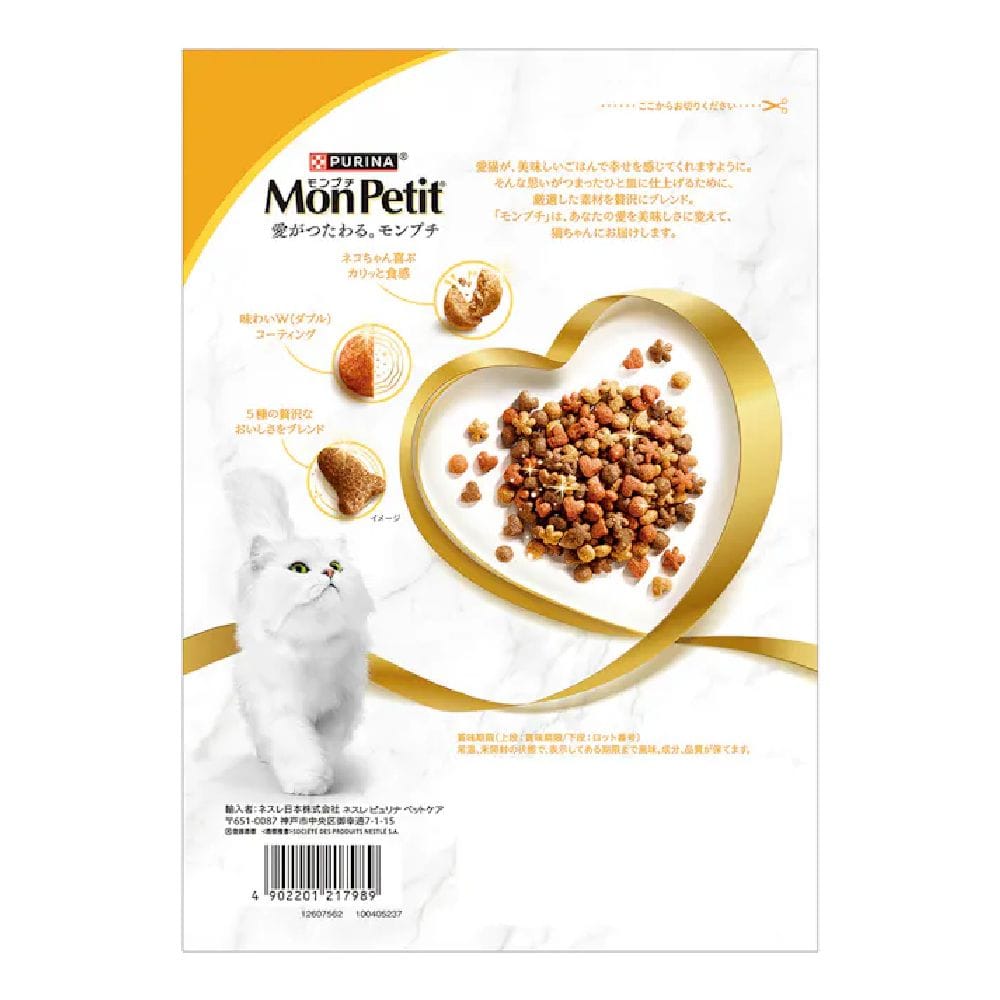 穀類(とうもろこし、小麦、とうもろこしたんぱく、米等)、肉類(チキンミール等)、動物性油脂、たんぱく加水分解物、魚介類(まぐろ、かつお)、フレーバーブレンド(ターキー、ラム、小魚等)、ミネラル類(カルシウム、リン、カリウム、ナトリウム、クロライド、鉄、銅、マンガン、亜鉛、ヨウ素、セレン)、ビタミン類(A、E、K、B1、B2、パントテン酸、ナイアシン、B6、葉酸、ビオチン、B12、コリン)、アミノ酸類(メチオニン、タウリン)、着色料(カラメル色素、カロテノイド色素)