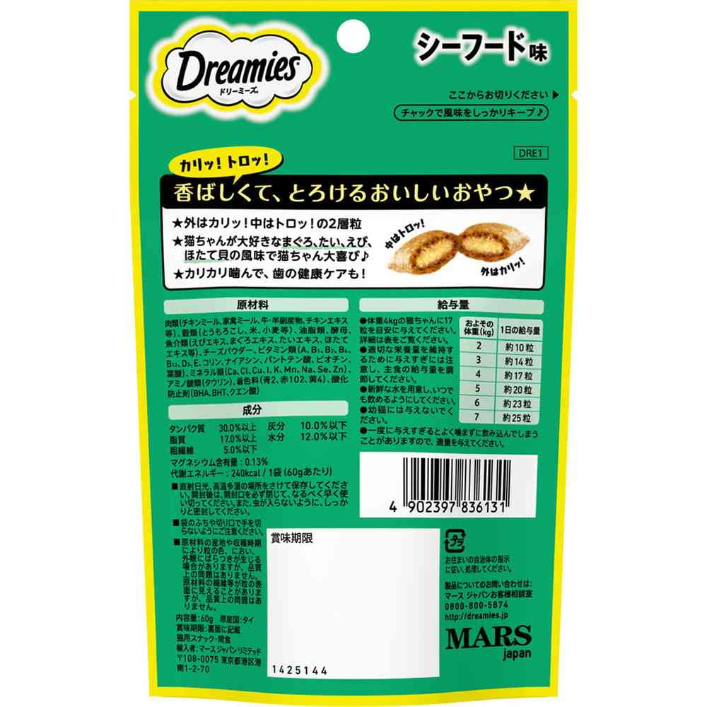 外はカリッ!中はトロッ!の2層粒と、猫ちゃんが大好きなシーフードの風味たっぷりでたまらないおいしさ☆ 猫ちゃん大喜びのおやつ!