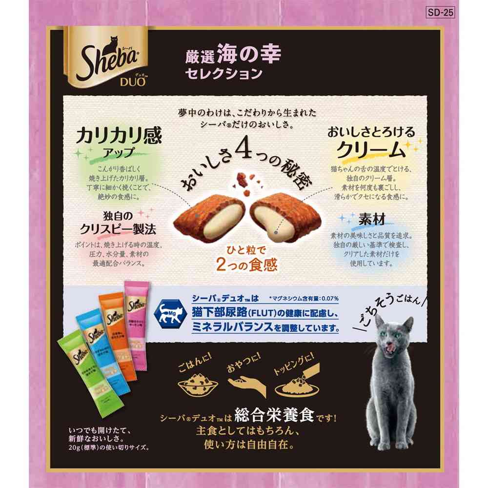 肉類(チキンミール、牛・羊副産物、チキンエキス、家禽ミール、ビーフエキス、ささみエキス等)、穀類(とうもろこし、米、小麦等)、油脂類、酵母、魚介類(ほたてエキス、白身魚エキス、たいエキス、サーモンエキス、まぐろエキス、えびエキス、ずわいがにエキス等)、ビタミン類(A、B1、B2、B6、B12、D3、E、コリン、ナイアシン、パントテン酸、葉酸)、ミネラル類(Ca、Cl、Cu、Fe、I、K、Mn、Na、Se、Zn)、アミノ酸類(タウリン)、着色料(カラメル、青2、赤102、黄4)、酸化防止剤(BHA、BHT、クエン酸)