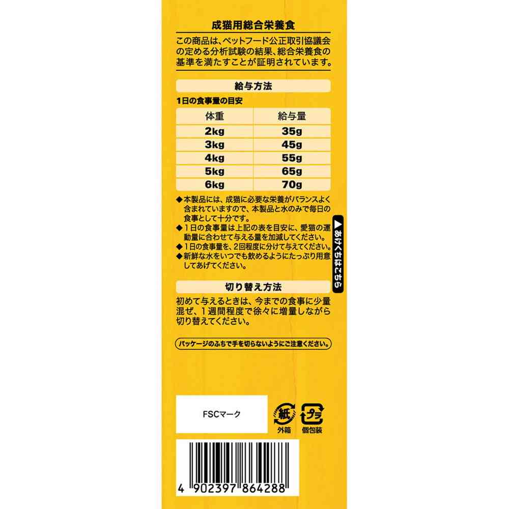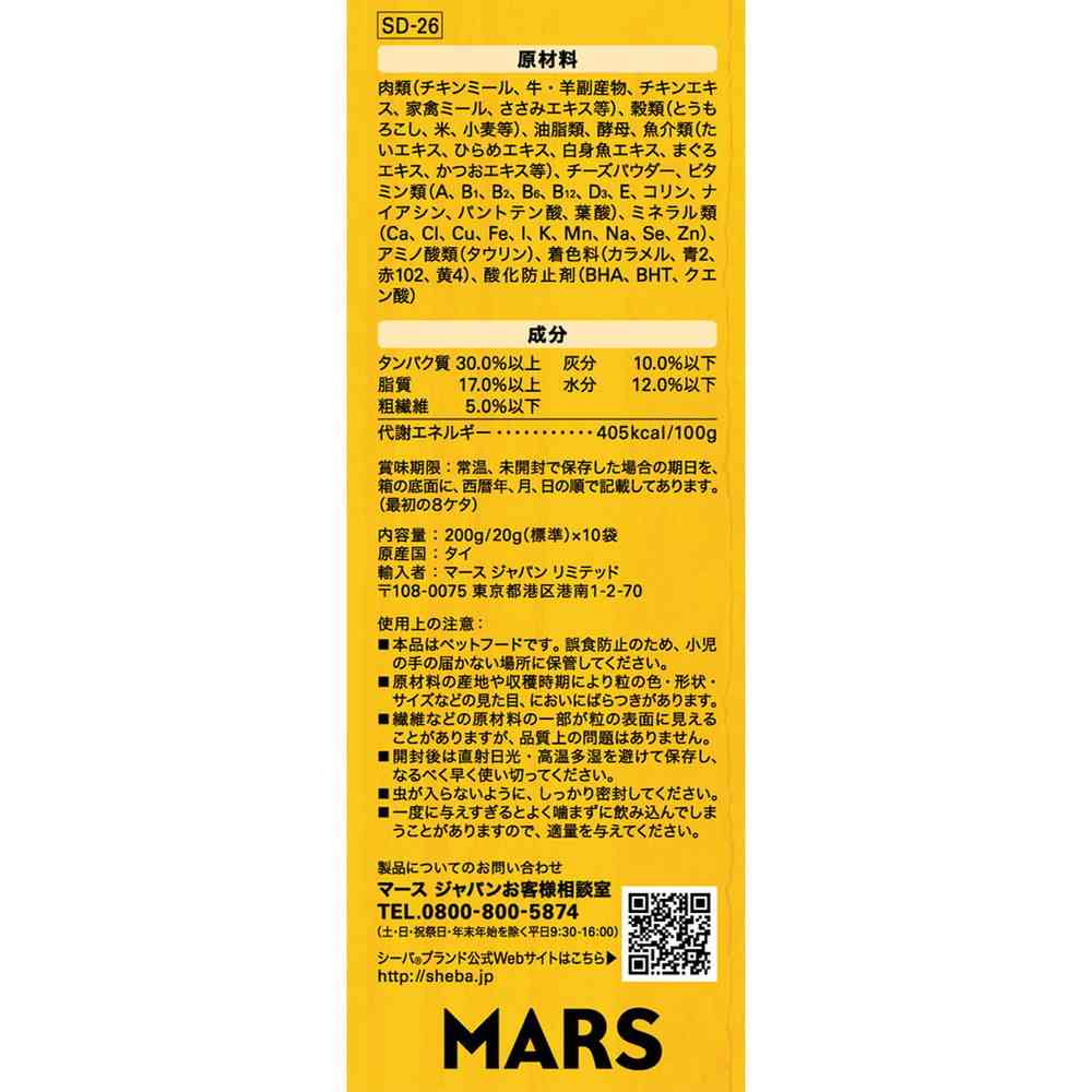 肉類(チキンミール、牛・羊副産物、チキンエキス、家禽ミール、ささみエキス等)、穀類(とうもろこし、米、小麦等)、油脂類、酵母、魚介類(たいエキス、ひらめエキス、白身魚エキス、まぐろエキス、かつおエキス等)、チーズパウダー、ビタミン類(A、B1、B2、B6、B12、D3、E、コリン、ナイアシン、パントテン酸、葉酸)、ミネラル類(Ca、Cl、Cu、Fe、I、K、Mn、Na、Se、Zn)、アミノ酸類(タウリン)、着色料(カラメル、青2、赤102、黄4)、酸化防止剤(BHA、BHT、クエン酸)