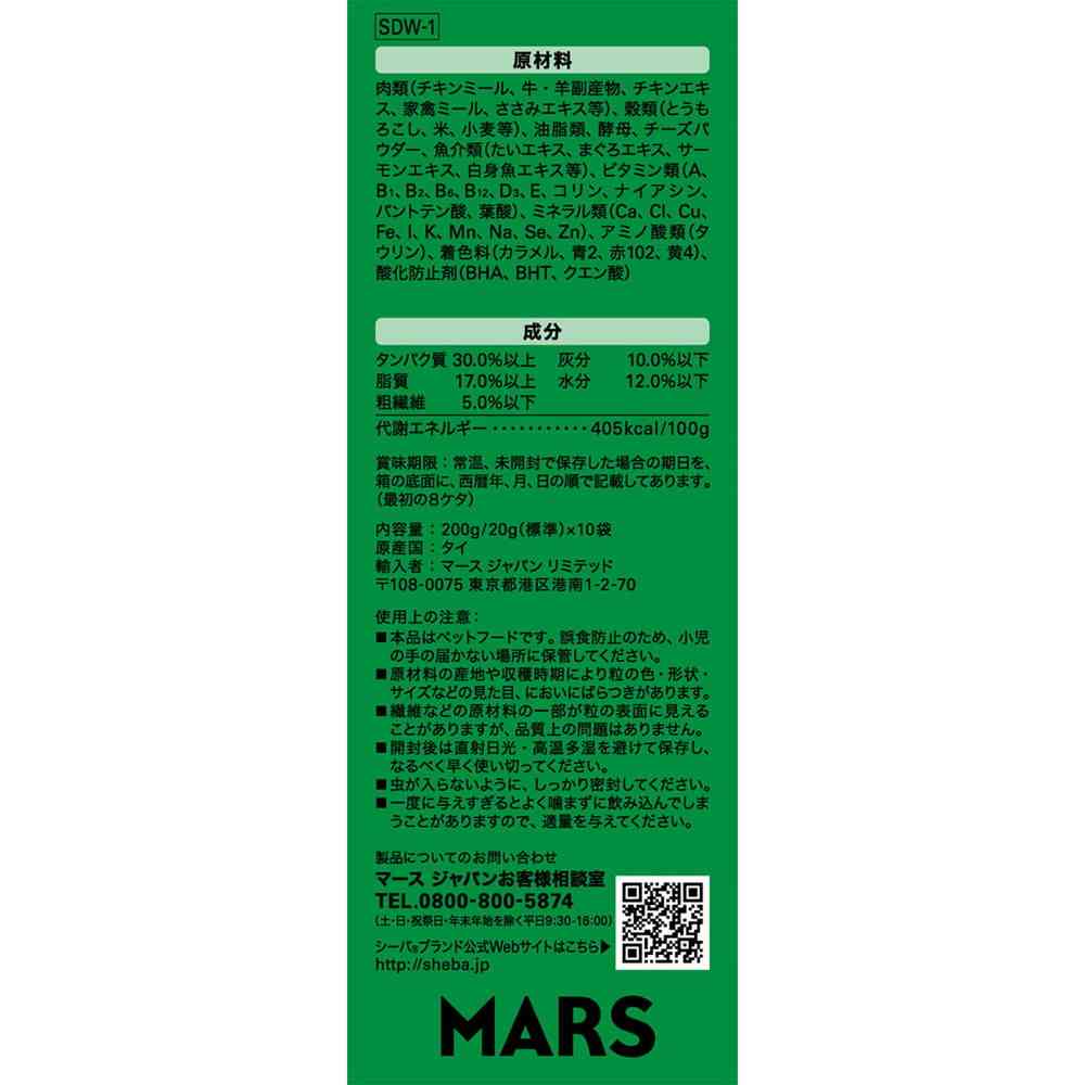 肉類(チキンミール、牛・羊副産物、チキンエキス、家禽ミール、ささみエキス等)、穀類(とうもろこし、米、小麦等)、油脂類、酵母、チーズパウダー、魚介類(たいエキス、まぐろエキス、サーモンエキス、白身魚エキス等)、ビタミン類(A、B1、B2、B6、B12、D3、E、コリン、ナイアシン、パントテン酸、葉酸)、ミネラル類(Ca、Cl、Cu、Fe、I、K、Mn、Na、Se、Zn)、アミノ酸類(タウリン)、着色料(カラメル、青2、赤102、黄4)、酸化防止剤(BHA、BHT、クエン酸)