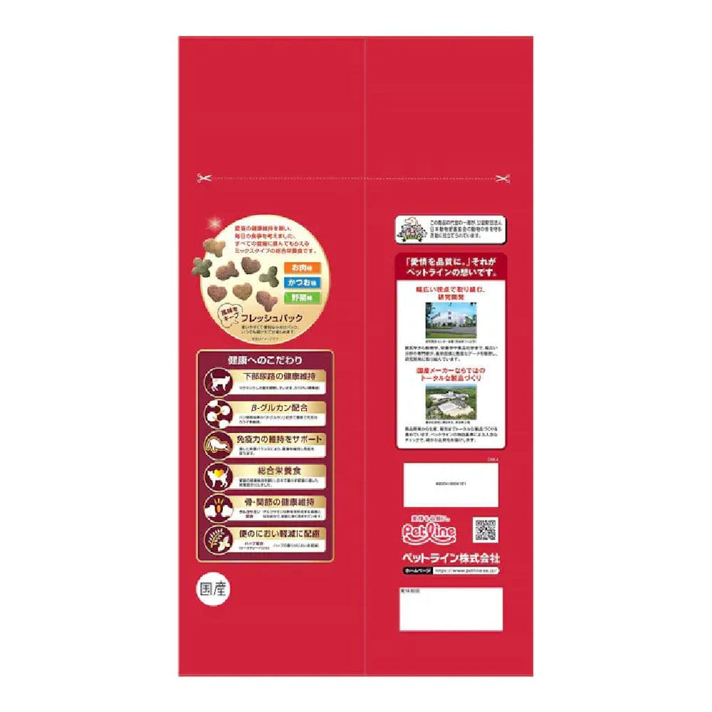 お肉もお魚も大好きなよくばりな愛猫のために、お肉味、かつお味、野菜味をミックス、β‐グルカン、グルコサミン、ハーブを配合。猫の下部尿路の健康維持に配慮してマグネシウムを調整。