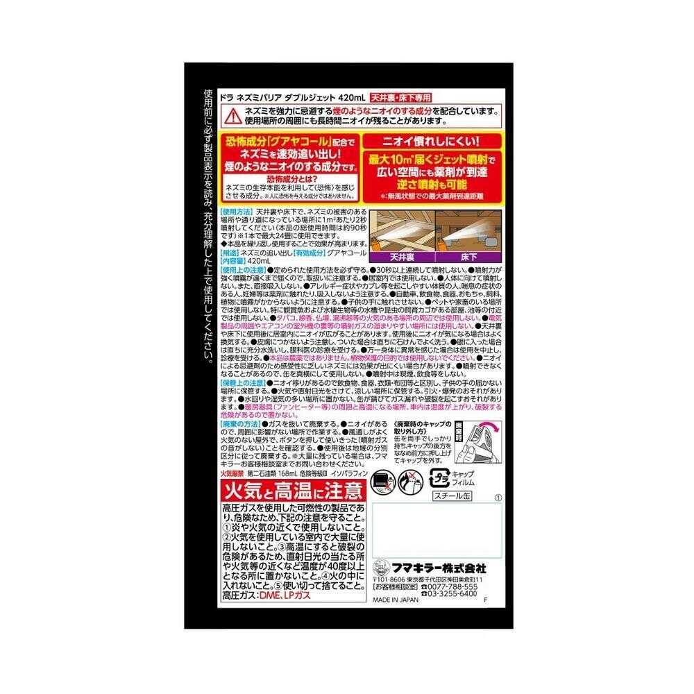 ネズミを強力に忌避する煙のようなニオイのする成分を配合しています。 使用場所の周囲にも長時間ニオイが残ることがあります。 ●定められた使用方法を必ず守る。 ●30秒以上連続して噴射しない。 ●噴射力が強く噴霧が遠くまで届くので、取扱いに注意する。 ●居室内では使用しない。 ●人体に向けて噴射しない。また、直接吸入しない。 ●アレルギー症状やカブレ等を起こしやすい体質の人、喘息の症状のある人、妊婦等は薬剤に触れたり、吸入しないよう注意する。 ●自動車、飲食物、食器、おもちゃ、飼料、植物には噴霧がかからないように注意する。 ●子供の手に触れさせない。 ●ペットや家畜のいる場所では使用しない。特に観賞魚および水棲生物等の水槽や昆虫の飼育カゴがある部屋、池等の付近では使用しない。 ●タバコ、線香、仏壇、湯沸器等の火気のある場所の周辺では使用しない。 ●電気製品の周囲やエアコンの室外機の裏等の噴射ガスの溜まりやすい場所には使用しない。 ●天井裏や床下に使用後に居室内にニオイが広がることがあります。使用後にニオイが気になる場合はよく換気する。 ●皮膚につかないように注意し、ついた場合は直ちに石けんでよく洗う。 ●眼に入った場合は直ちに充分水洗いし、眼科医の診療を受ける。 ●万一身体に異常を感じた場合は使用を中止し、診療を受ける。 ●本品は農薬ではありません。植物保護の目的では使用しないでください。 ●ニオイによる忌避剤のため感受性の乏しいネズミには効果が出にくい場合があります。 ●噴射できなくなることがあるので、缶を真横にして使用しない。 ●噴射中は喫煙、飲食等をしない。 ●ニオイ移りがあるので飲食物、食器、衣類・布団等と区別し、子供の手の届かない場所に保管する。 ●火気や直射日光をさけて、涼しい場所に保管する。引火・爆発のおそれがあります。 ●水回りや湿気の多い場所に置かない。缶が錆びてガス漏れや破裂を起こすおそれがあります。 ●暖房器具(ファンヒーター等)の周囲と高温になる場所、車内は温度が上がり、破裂する危険があるので置かない。