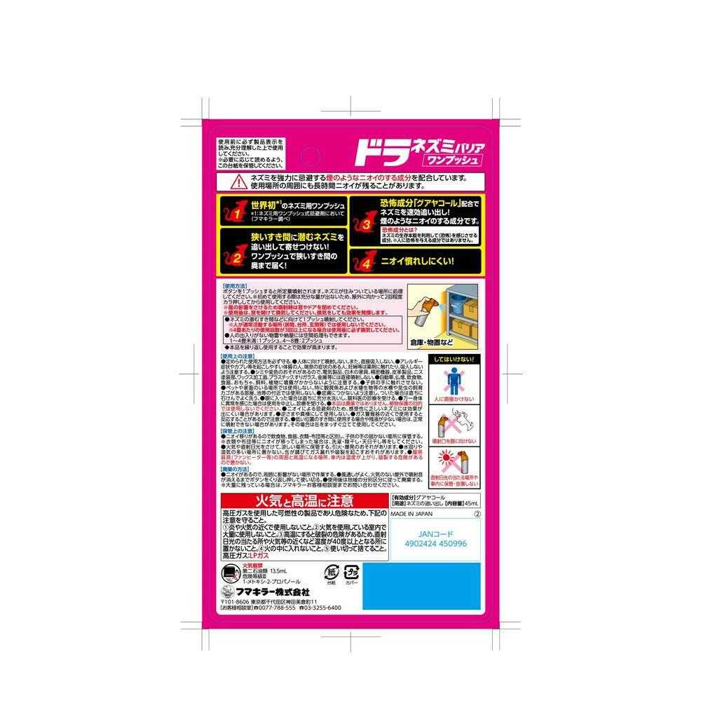 ※初めて使用する際は充分な量が出ないため、屋外に向かって2回程度カラ押ししてから使用してください。 ※風の影響をさけるため噴射時は窓を閉めてください。 ※使用後は窓を開けて換気してください。換気をしても効果を発揮します。 使用上の注意 ●定められた使用方法を必ず守る。 ●人体に向けて噴射しない。また、直接吸入しない。 ●アレルギー症状やカブレ等を起こしやすい体質の人、喘息の症状のある人、妊婦等は薬剤に触れたり、吸入しないよう注意する。 ●シミや変色のおそれがあるので、電気製品、白木の家具、精密機器、皮革製品、ニス塗装部、ワックス加工面、プラスチック、すりガラス、金属等には直接噴射しない。 ●自動車、仏壇、飲食物、食器、おもちゃ、飼料、植物に噴霧がかからないように注意する。 ●子供の手に触れさせない。 ●ペットや家畜のいる場所では使用しない。特に観賞魚および水棲生物等の水槽や昆虫の飼育カゴがある部屋、池等の付近では使用しない。 ●皮膚につかないように注意し、ついた場合は直ちに石けんでよく洗う。 ●眼に入った場合は直ちに充分水洗いし、眼科医の診療を受ける。 ●万一身体に異常を感じた場合は使用を中止し、診療を受ける。 ●本品は農薬ではありません。植物保護の目的では使用しないでください。 ●ニオイによる忌避剤のため、感受性の乏しいネズミには効果が出にくい場合があります。 ●逆さまや真横にして使用しない。 ●ガス警報器の近くで使用すると反応することがあるので注意する。 ●低い位置のすき間に使用する場合や残液が少ない場合は、正常に噴射できない場合があります。その場合は缶をまっすぐ立てて使用してください。