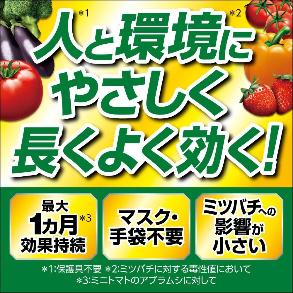 商品説明●幅広い野菜&病害虫に使用できる! 吸汁害虫、チョウ目害虫、うどんこ病など、幅広い病害虫に効果があります。 ●環境にやさしい*2! 非ネオニコチノイド処方でミツバチにも影響が小さい環境配慮型の製品です。 *2:ミツバチに対する毒性値において ●アミノ酸&AO(アルギン酸オリゴ糖)配合で野菜を美味しく育てられる! 日照不足のような環境でも元気に育ちます。