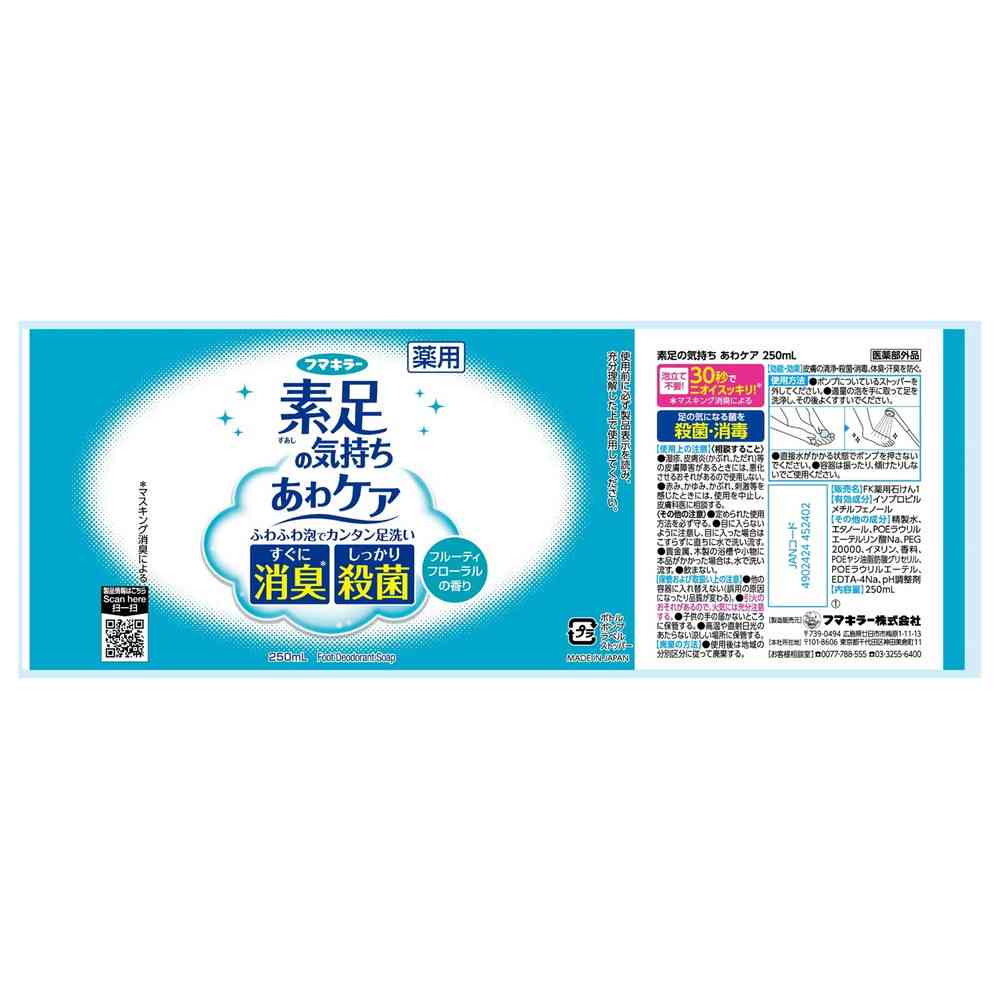 ●足のニオイをしっかり消臭(マスキング消臭による) ●足の気になる菌を殺菌・消毒! ●泡で出るから簡単に洗える ●ポンプについているストッパーを外してください。 ●適量の泡を手に取って足を洗浄し、その後よくすすいでください。 ●直接水がかかる状態でポンプを押さないでください。 ●容器は振ったり、傾けたりしないでご使用ください。