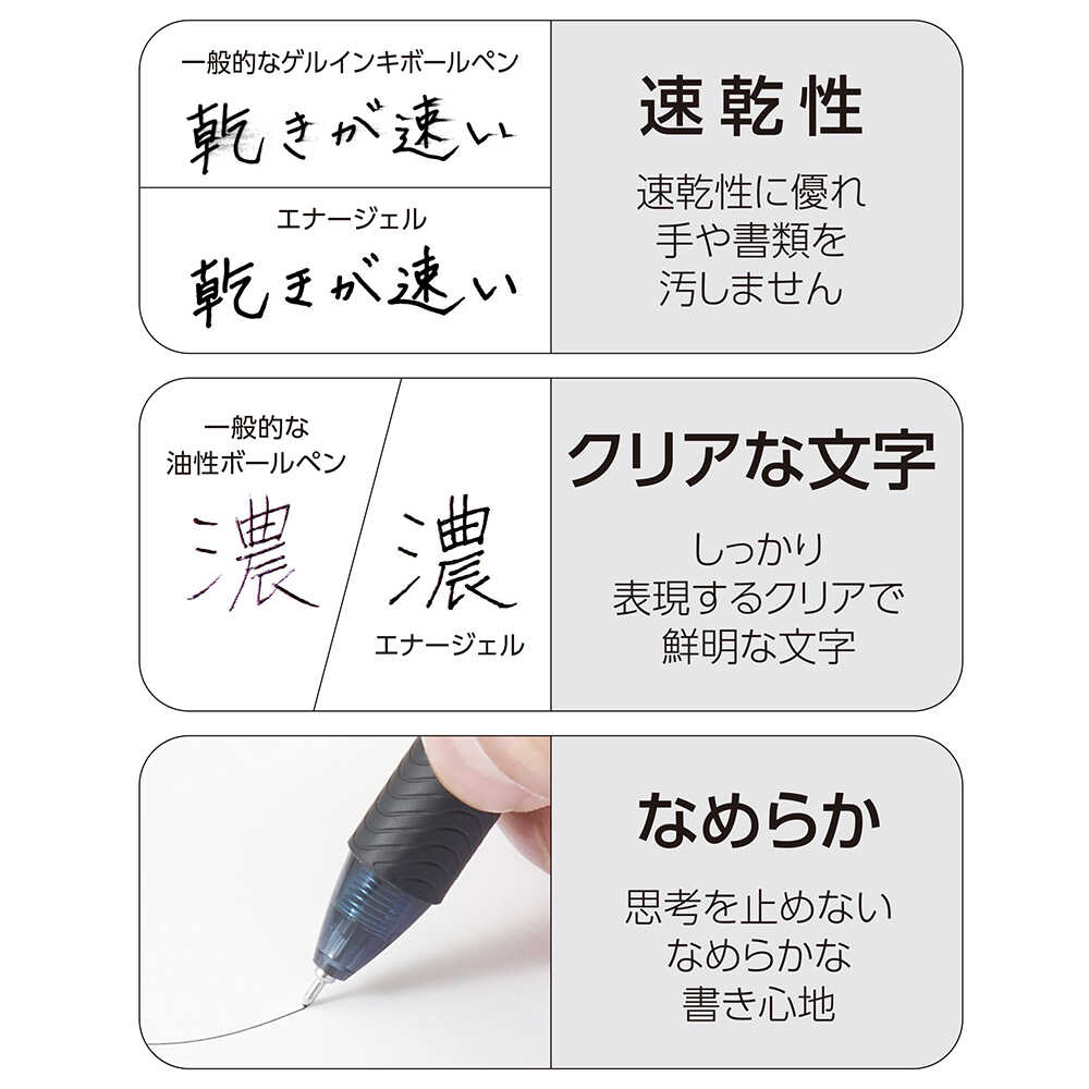 エナージェルインキ採用。 軽くなめらかな書き味。 濃くはっきりとした文字が書け、速記にも強く、乾きも速い。 ノックしてすばやく書けます。