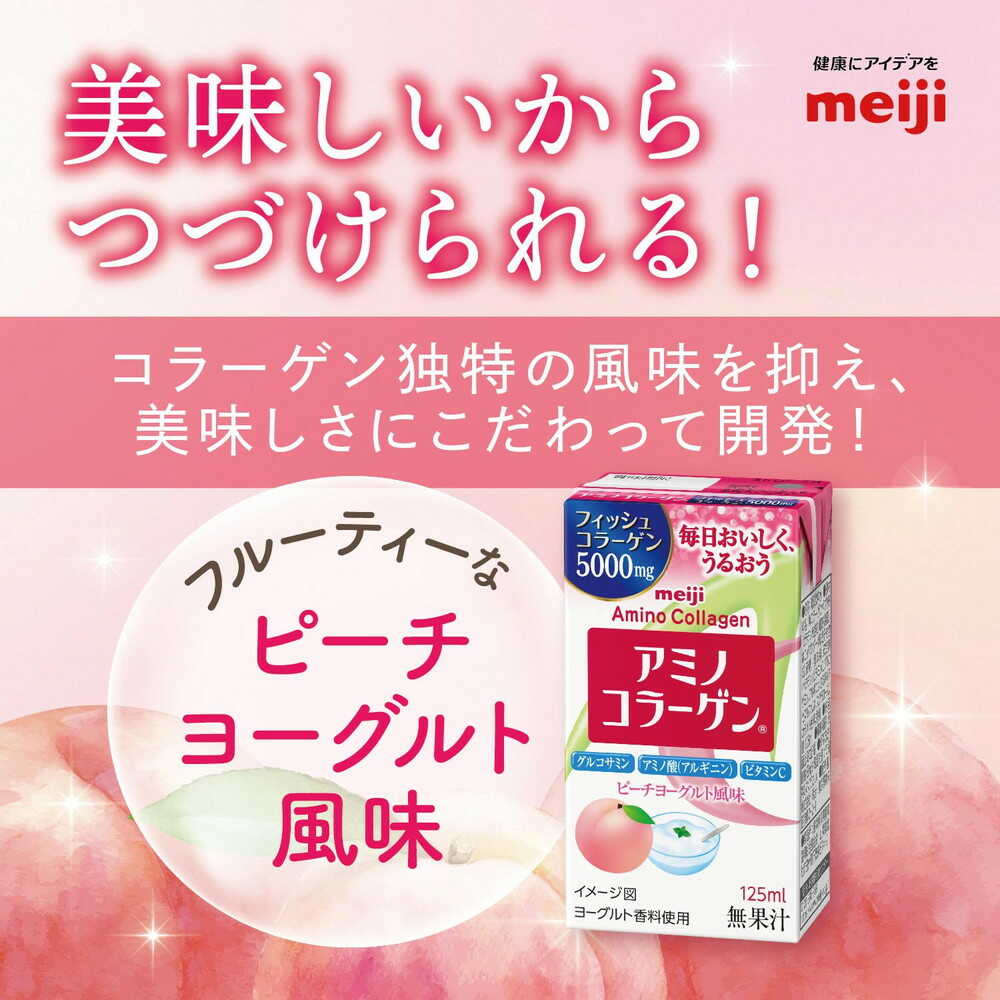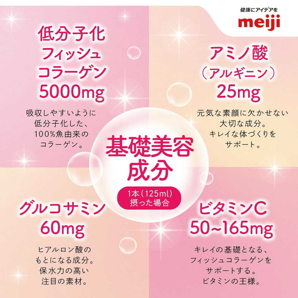 原材料名:魚コラーゲンペプチド(ゼラチンを含む)(国内製造)、ホエイパウダー(乳成分を含む)、砂糖/酸味料、安定剤(ペクチン)、ビタミンC、グルコサミン、アルギニン、甘味料(アセスルファムK、スクラロース)、カラメル色素、香料 栄養成分表示 1本(125ml)あたり エネルギー 48kcal たんぱく質 6.3g 脂質 0g 炭水化物 5.7g 食塩相当量 0.077g ビタミンC 50~165mg コラーゲンペプチド 5000mg アルギニン 25mg グルコサミン 60mg