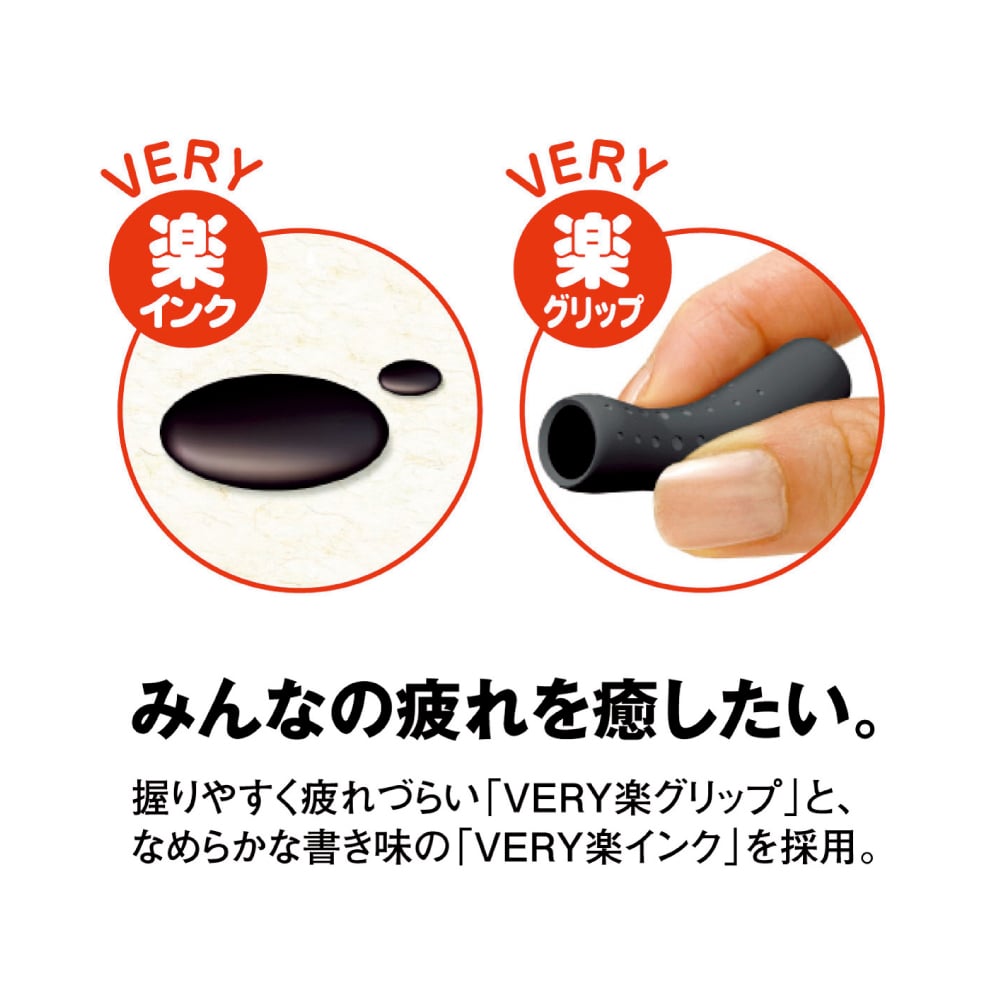 みんなの疲れを癒したい。握りやすく疲れづらい「VERY楽グリップ」と、なめらかな書き味の「VERY楽インク」を採用。