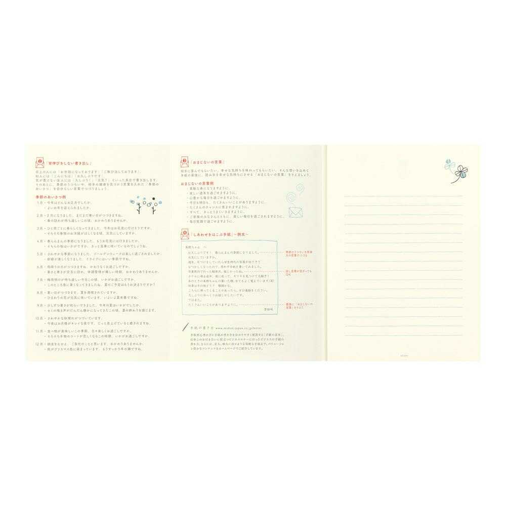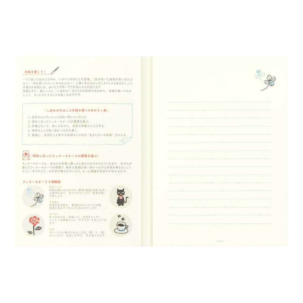 クローバー、くろねこ、コーヒー、バラの4つのラッキーモチーフをあしらった、本のように開いて書ける便箋です。 表紙を開いた左ページには、季節のあいさつやおまじないの言葉など、手紙を書く時に参考になるテキストがついています。