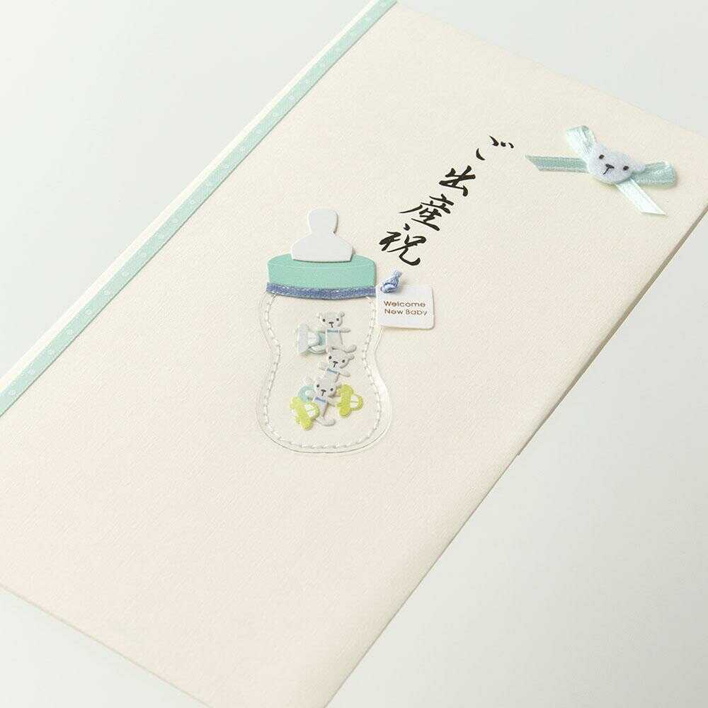 立体的なハンドメイドのクラフトシールが付いた金封です。 哺乳瓶の中に小さなクマやクルマが入った、かわいらしいデザインです。