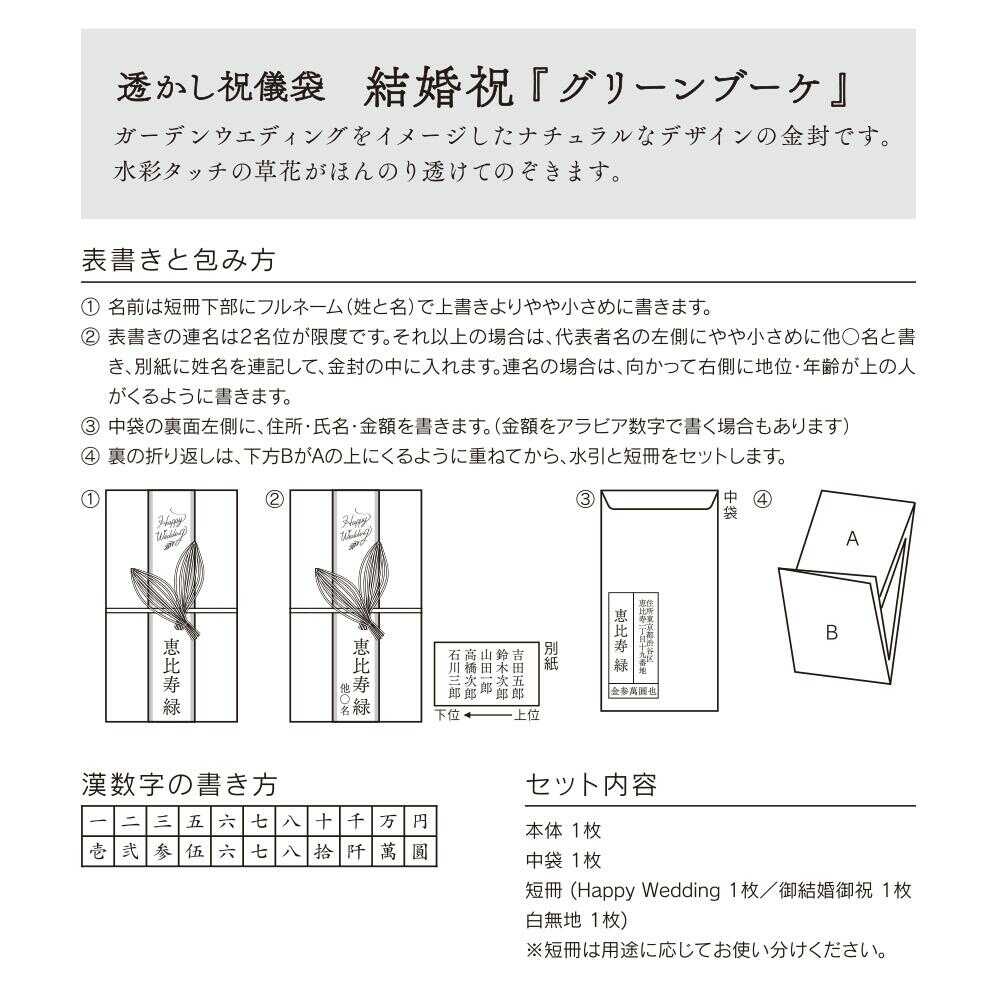 ガーデンウェディングをイメージさせる草花が、ほんのり透けてのぞく祝儀袋です。 ガーデンによく合う植物や葉が多く入った、すっきりとした緑色の、さわやかな「グリーンブーケ柄」。 水引はリーフ(葉)をイメージしています。 短冊(Happy Wedding、御結婚御祝、無地各1枚) 表書きと包み方解説付 金額目安:2~5万円