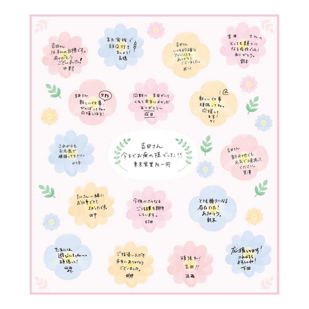 簡単に寄せ書きができる、シール付き色紙。 晴れやかな人生の門出にふさわしい「花柄」は、柔らかなタッチのカラフルな花々が色紙を楽しく彩ります。 記入用シール16枚、タイトルシール1枚、飾りシール12枚