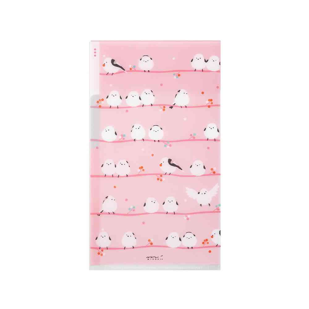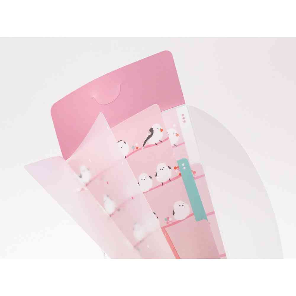 用途ごとに書類をざっくり仕分けられる3ポケット仕様のクリアホルダーです。 チケット、A4 三つ折り、マスク、小物が入るA5スリムサイズ。 フタ付きなので、鞄の中で中身がバラバラとこぼれません。 並んで枝にとまっている姿に癒される、小さなシマエナガたちがデザインされています。